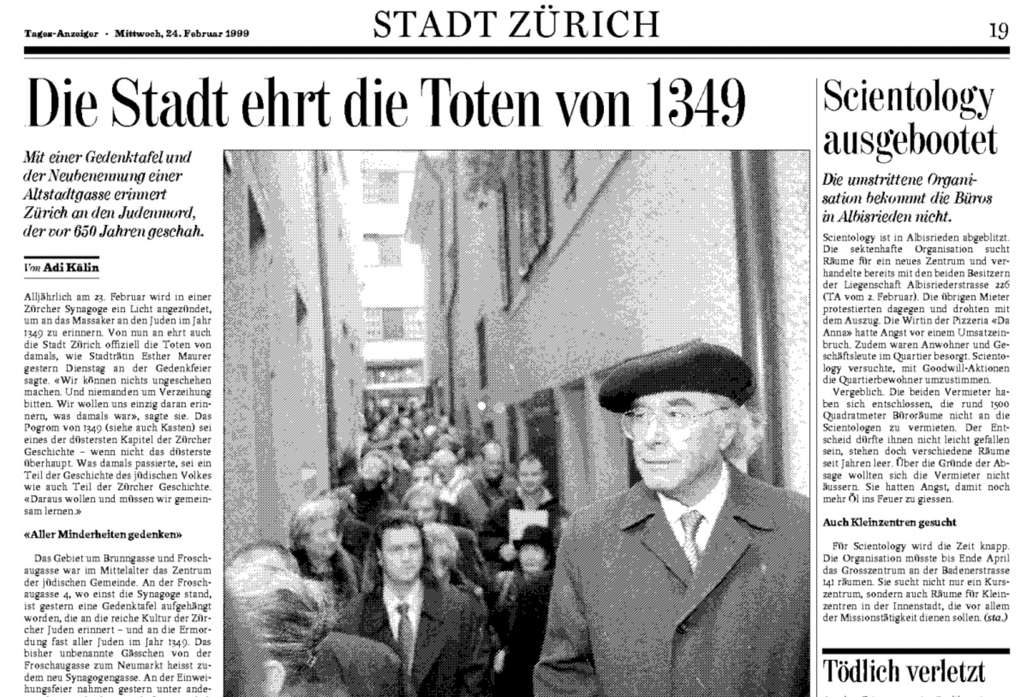 Schaubs Postulat wurde abgelehnt. Doch die Stadt Zürich ging auf das Anliegen ein, für das sich zuvor schon die Journalistin Vivianne Berg eingesetzt hatte: Eine bis dahin namenlose Gasse bekam den Namen "Synagogengasse". Zudem brachte man bei der Froschaugasse 4 eine Gedenktafel für die jüdischen Opfer des Pogroms an.