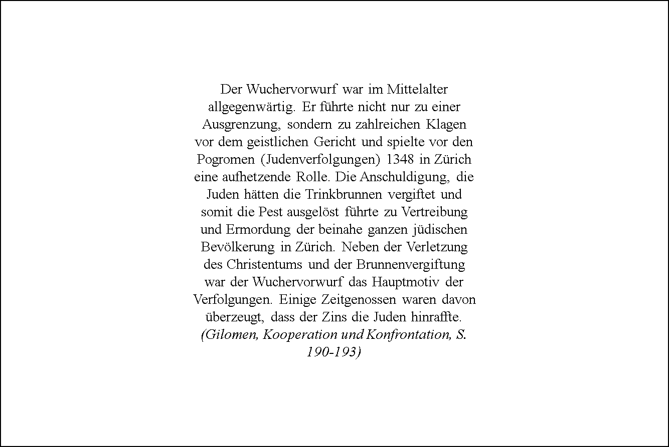Was aber die "Wuchertätigkeit" für die Juden bedeutete und heute noch bedeutet, wird diese Reise durch das Zürcher Mittelalter vielleicht aufdecken können.