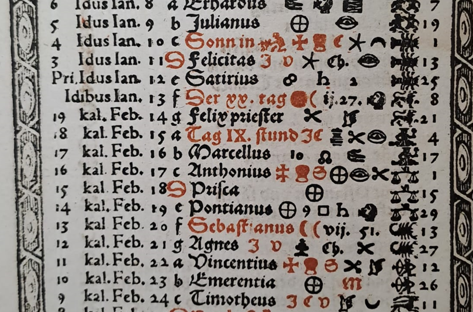 Ausschnitt des Kalenderblattes für den Monat Januar aus einem Buchkalender (Zürich 1579).