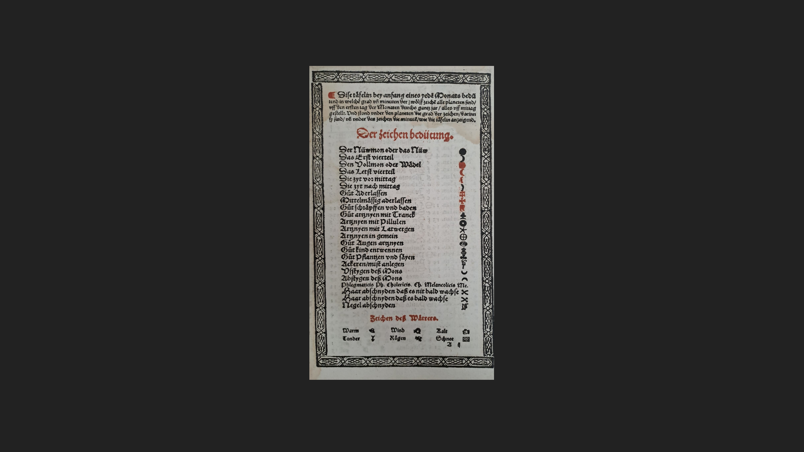 Liste der astrologischen Zeichen aus Butzlin, Johann Joachim: Kalender oder Laassbüchli sampt der Schreybtafel, Mässen und Jarmärckten uff das M.D.LXXIX. Jar. Getruckt zuo Zürych in der Froschouw: by Christoffel Froschouwer, [1578]. Zentralbibliothek Zürich. Ms D 271: b'1 https://doi.org/10.3931/e-rara-11694 / Public Domain Mark: Eigene Aufnahme.