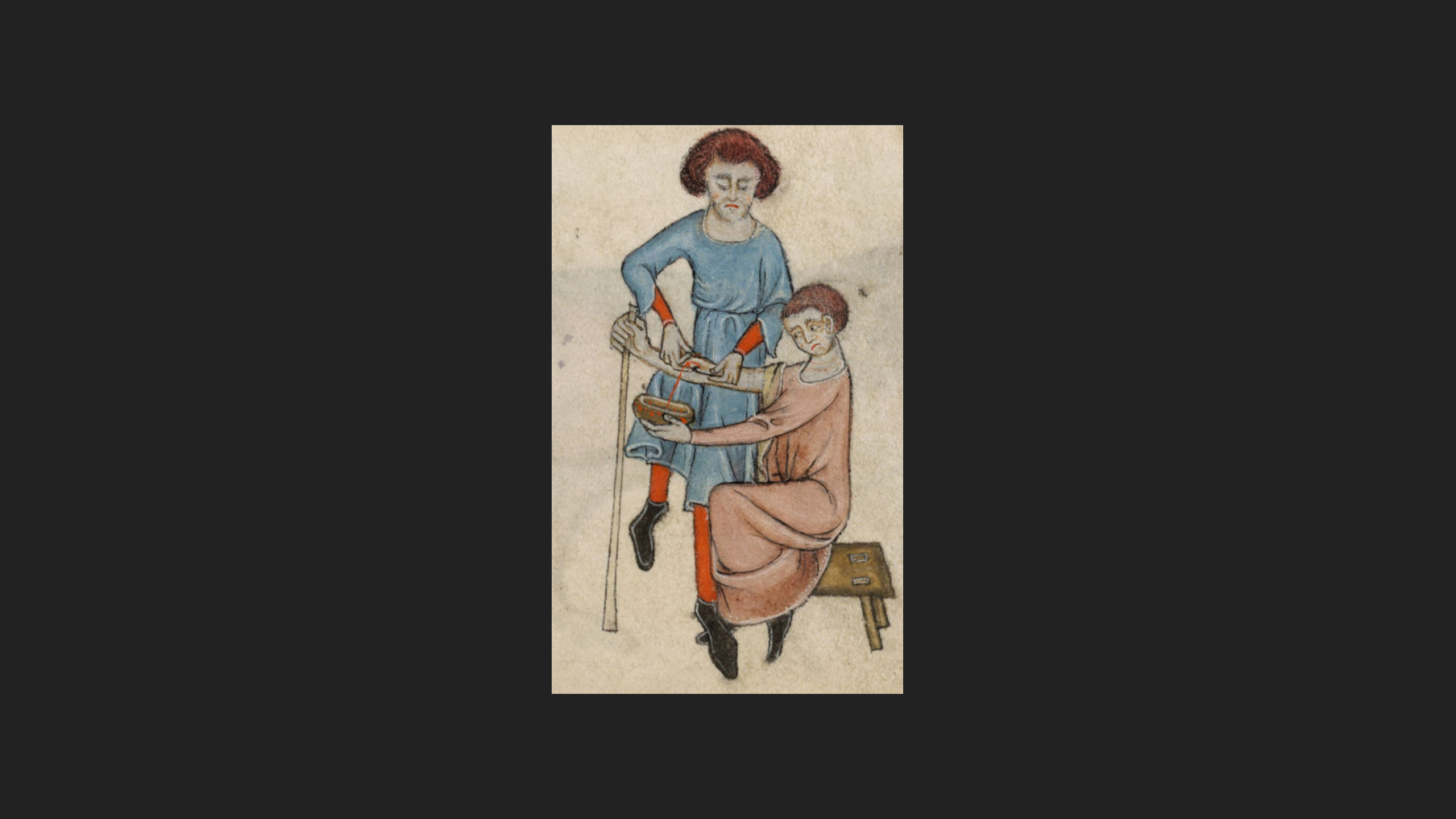 Aderlass. England, 14. Jahrhundert. Miniatur auf dem Luttrell-Psalter: https://commons.wikimedia.org/wiki/File:Psalter_1340.jpg, Datum des Zugriffs: 10.12.2023.