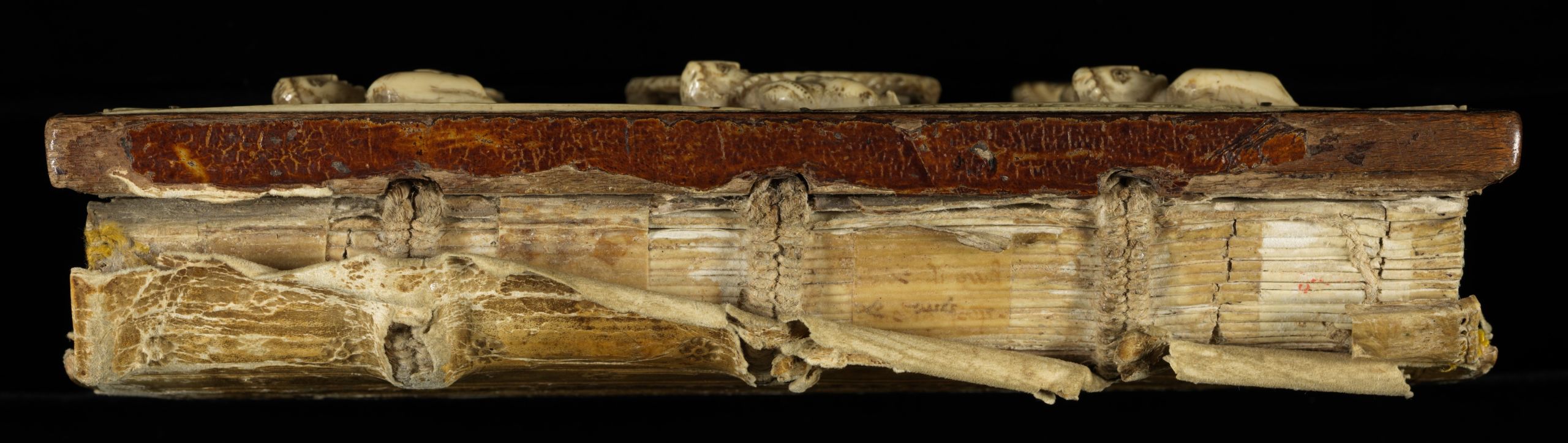 Als nächstes werden die Buchdeckel befestigt. Wenn Bunde vorhanden sind, sind sie der Ankerpunkt dafür. Die Buchdeckel bestehen im Normalfall zunächst wie oben erwähnt aus Holz. Wie sie mit dem Buchblock verbunden werden, ist abhängig von der Zeit und Region, in der ein Codex gebunden wurde. Die Innenseite der Deckel wird meistens mit einem Blatt Pergament oder Papier zugeklebt, um die Verbindung zwischen Decke und Buchblock zu verdecken. Zum Schluss wird der Codex noch in Leder gehüllt und verziert. Wenn es der Anlass oder der Auftrag verlangt, so kann diese Verzierung durchaus extrem oder manchmal sogar – Fans solcher Einbände mögen mir verzeihen – übertrieben sein.