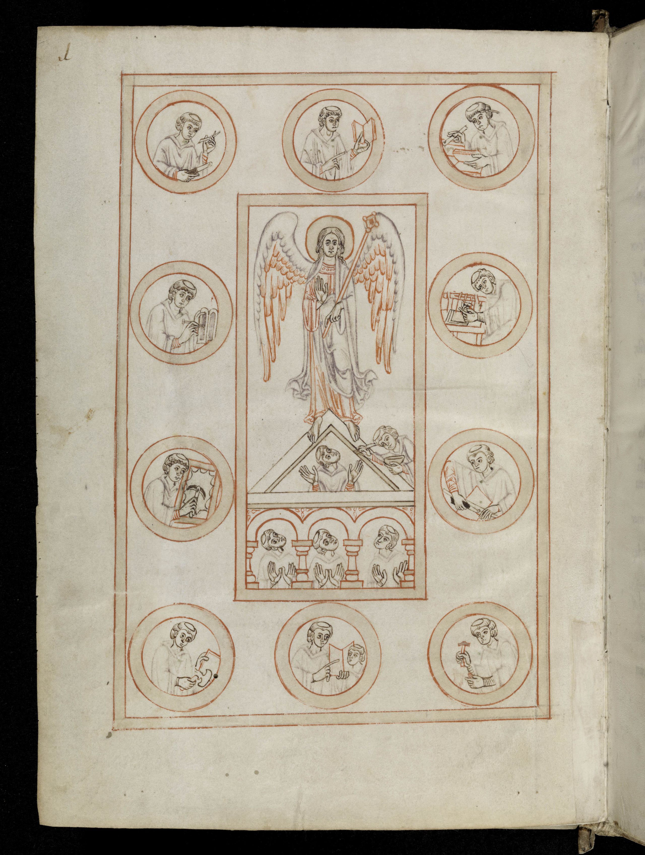 Die einzelnen Arbeitsschritte, die in einem Skriptorium zum Zug kommen werden in dieser Zeichnung dargestellt. Bamberg, Staatsbibliothek, Msc.Patr.5, f. 6v. urn:nbn:de:bvb:22-dtl-0000025604