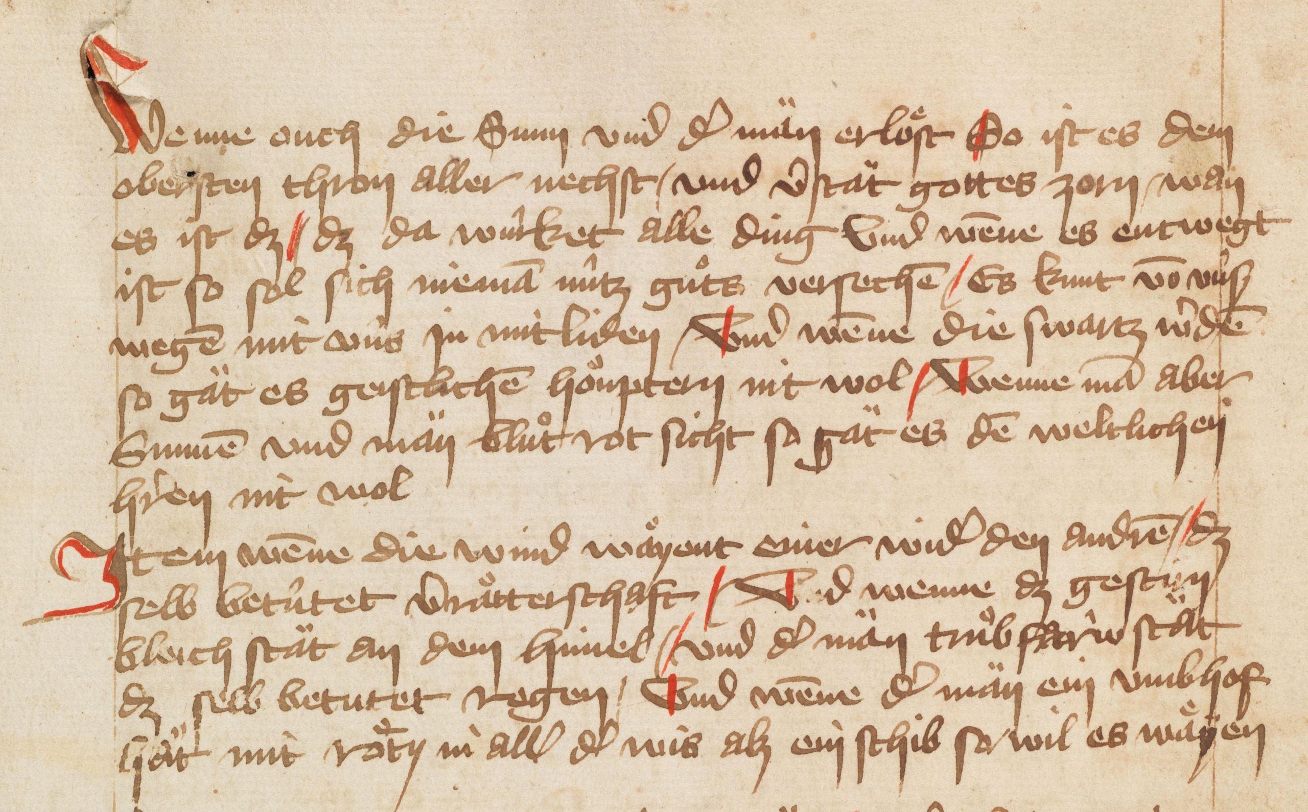 Die dringendste Frage, die sich mir stellte, war: «Warum tut man sich das an?» Das Christentum ist eine Schriftreligion und da Gottes Wort über die Schrift zum Menschen gelangt, ist sie an sich schon fast heilig. Das erklärt aber nur, warum man religiöse Texte geschrieben und abgeschrieben hat. Es erklärt nicht, warum es so eine Pracht wie die Manessische Liedersammlung gibt. Immerhin kam die Menschheit Tausende von Jahren auch mit mündlicher Erzählung aus. Was waren das für Menschen, die in mühevoller Detailarbeit ein ganzes Buch mit Liedtexten füllten?