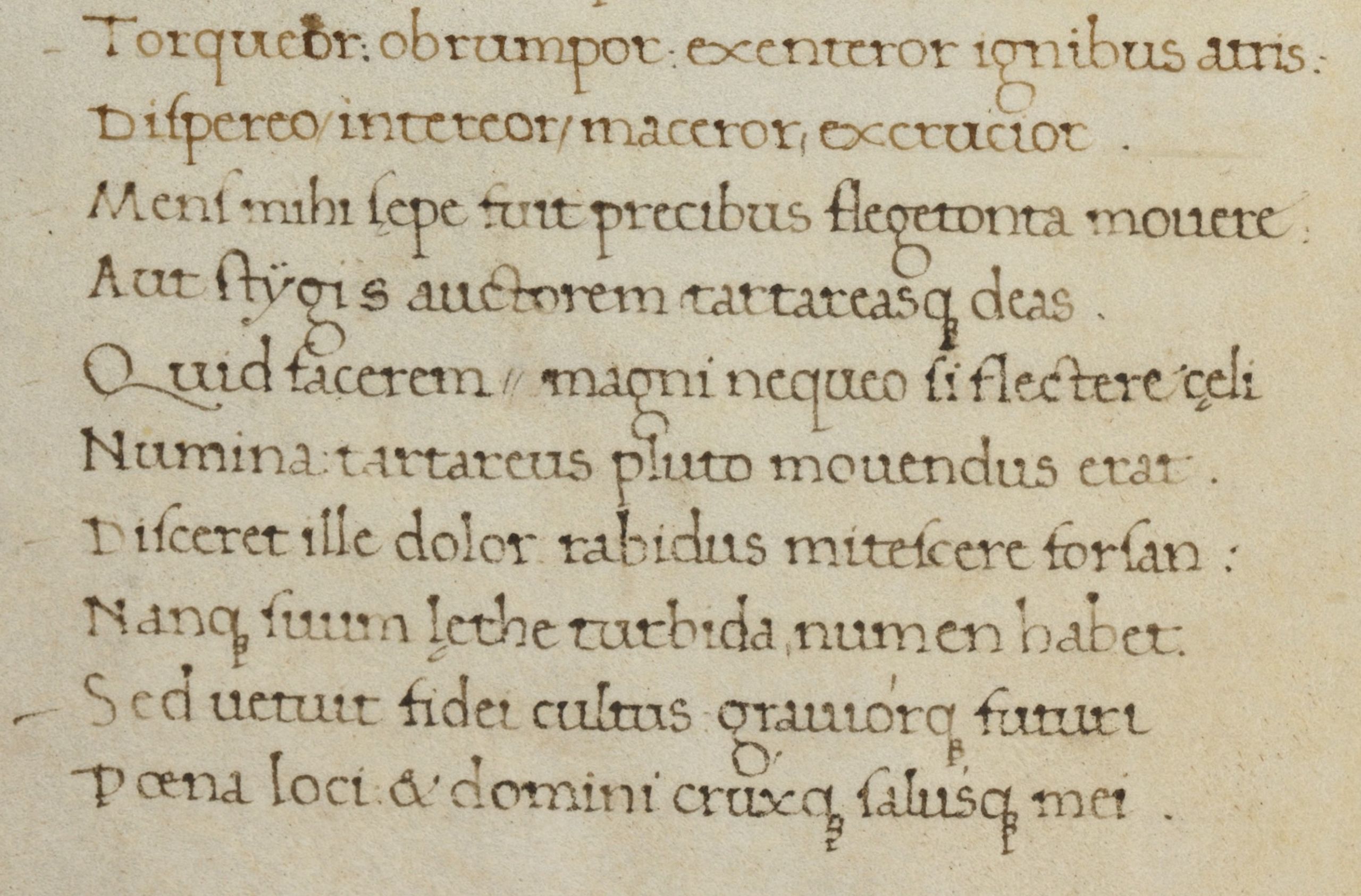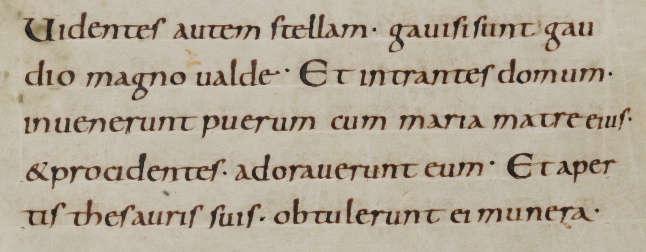 Am Anfang des Mittelalters verwendete jede Region ihre eigene Schrift. Gegen Ende des achten Jahrhunderts versuchte Karl der Grosse durch eine weitflächige Reformpolitik das Reich und die Kirche zu vereinheitlichen. Dazu gehörte auch eine Reform der Schriftkultur. Wo Skriptorien zuvor verschiedenste regionale Schriften benutzten, einigten sie sich bald auf eine einheitliche, «karolingische» Minuskel. Karl selbst hatte mit der Entwicklung der Schrift per se wahrscheinlich nichts am Hut. Delegieren ist schliesslich Hauptaufgabe eines Herrschers. Die Karolingische Minuskel ist auch für heutige Leser im Allgemeinen gut lesbar, besitzt aber einige Tücken. Zum einen gibt es einige Handschriften aus dieser Zeit, die noch in «scriptio continua», also ohne Wortabstände geschrieben sind. Ebenfalls ungewohnt ist das sogenannte «cc-a», eine Form des Buchstabens «a», die aussieht wie zwei «c» nebeneinander. Beide Eigenschaften sind aber Dinge, die die Karolingische Minuskel gerade abschaffen wollte, und verschwinden im Laufe der Benutzungszeit der Schrift. Trotzdem muss ein moderner Leser darauf vorbereitet sein!