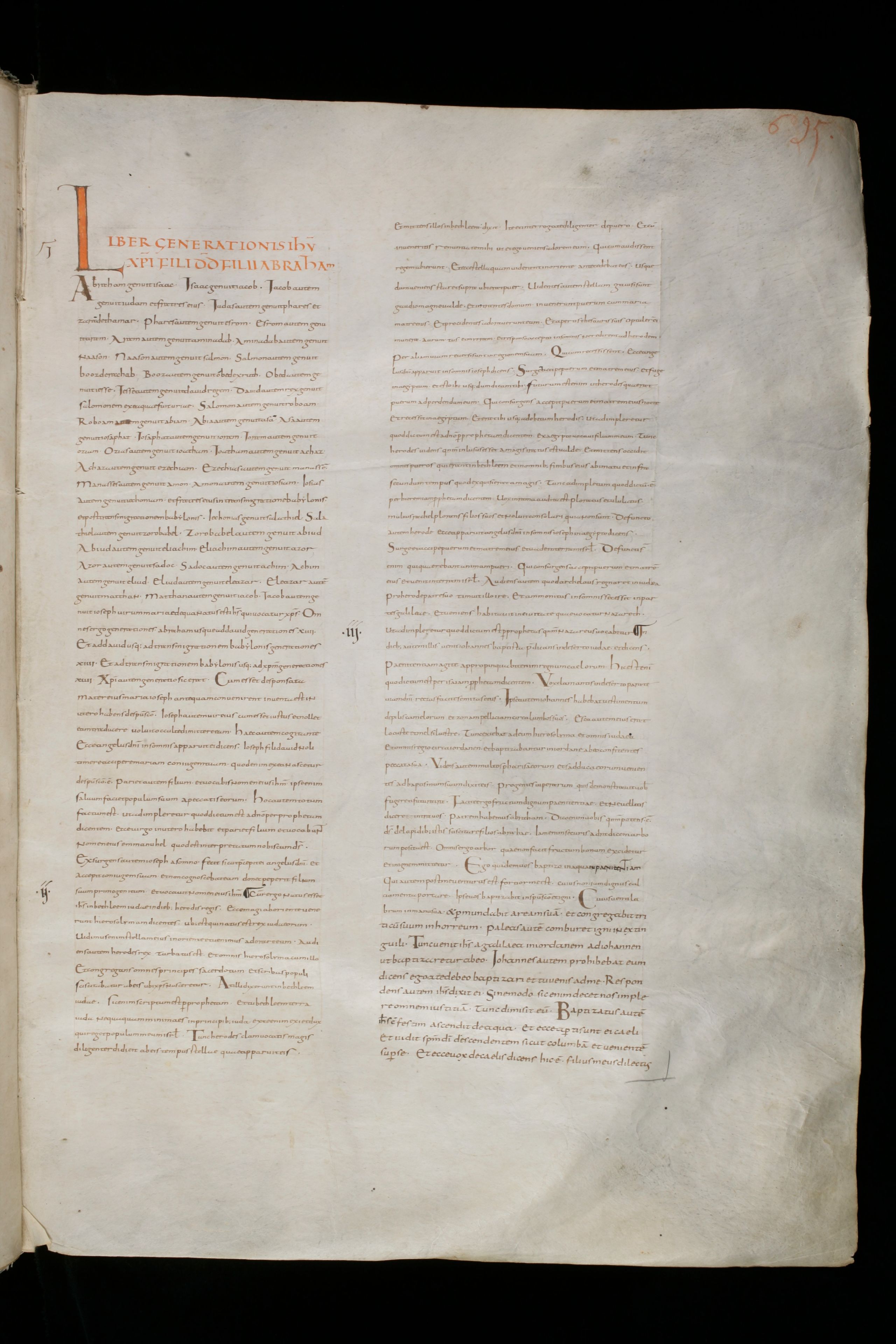 Beginn des Matthäusevangeliums. Eine solche Seite ist ca. 55cm hoch. St. Gallen, Stiftsbibliothek, Cod. Sang. 75, p. 695. https://www.e-codices.unifr.ch/en/list/one/csg/0075
