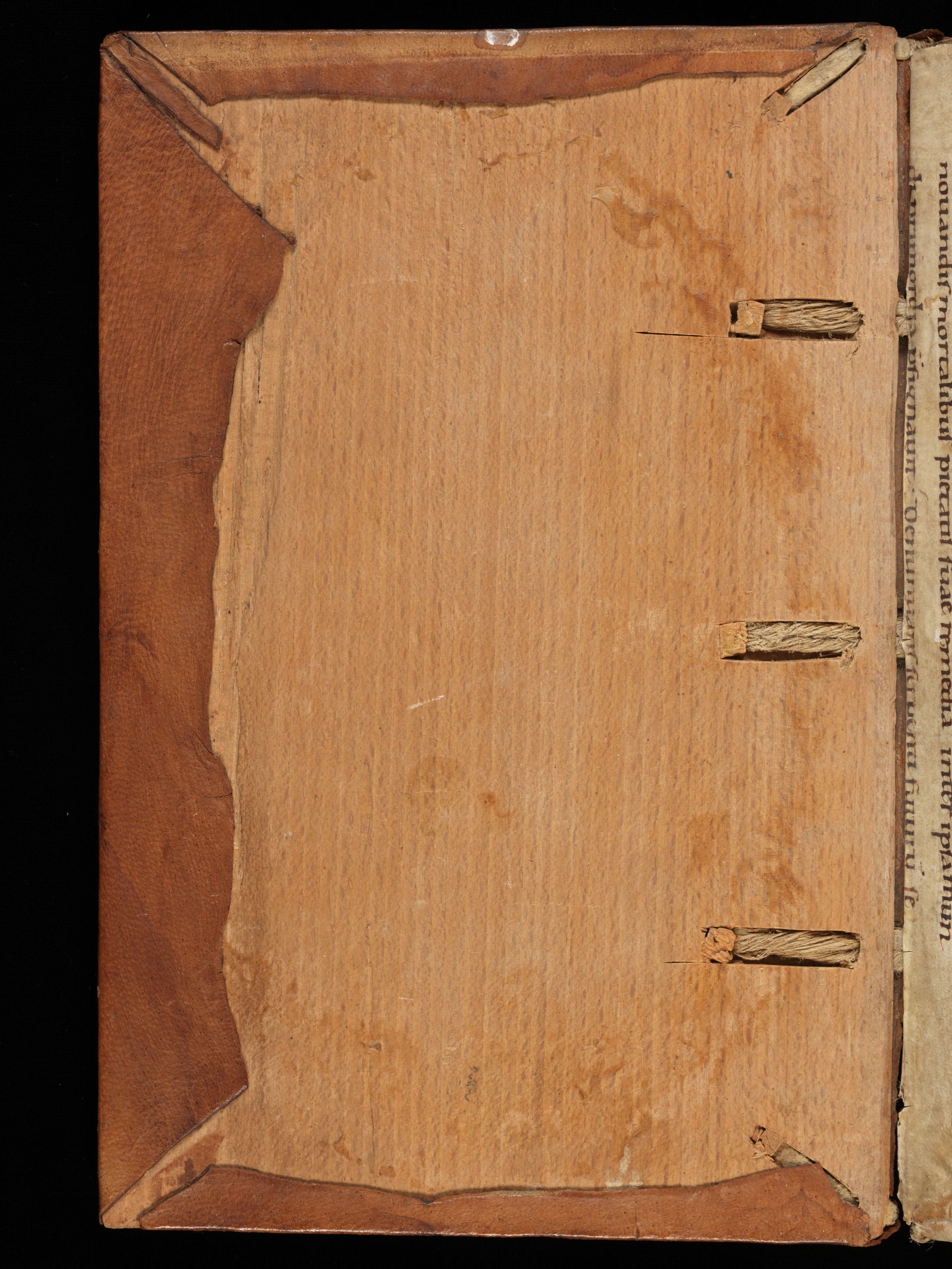 Die Innenseite dieser Buchdecke ist nicht beklebt, so ist die Verbindung zwischen Decke und Bünde sichtbar. St. Gallen, Stiftsarchiv (Abtei Pfäfers), Cod. Fab. X, Vordere Innenseite. https://www.e-codices.unifr.ch/de/list/one/ssg/0010