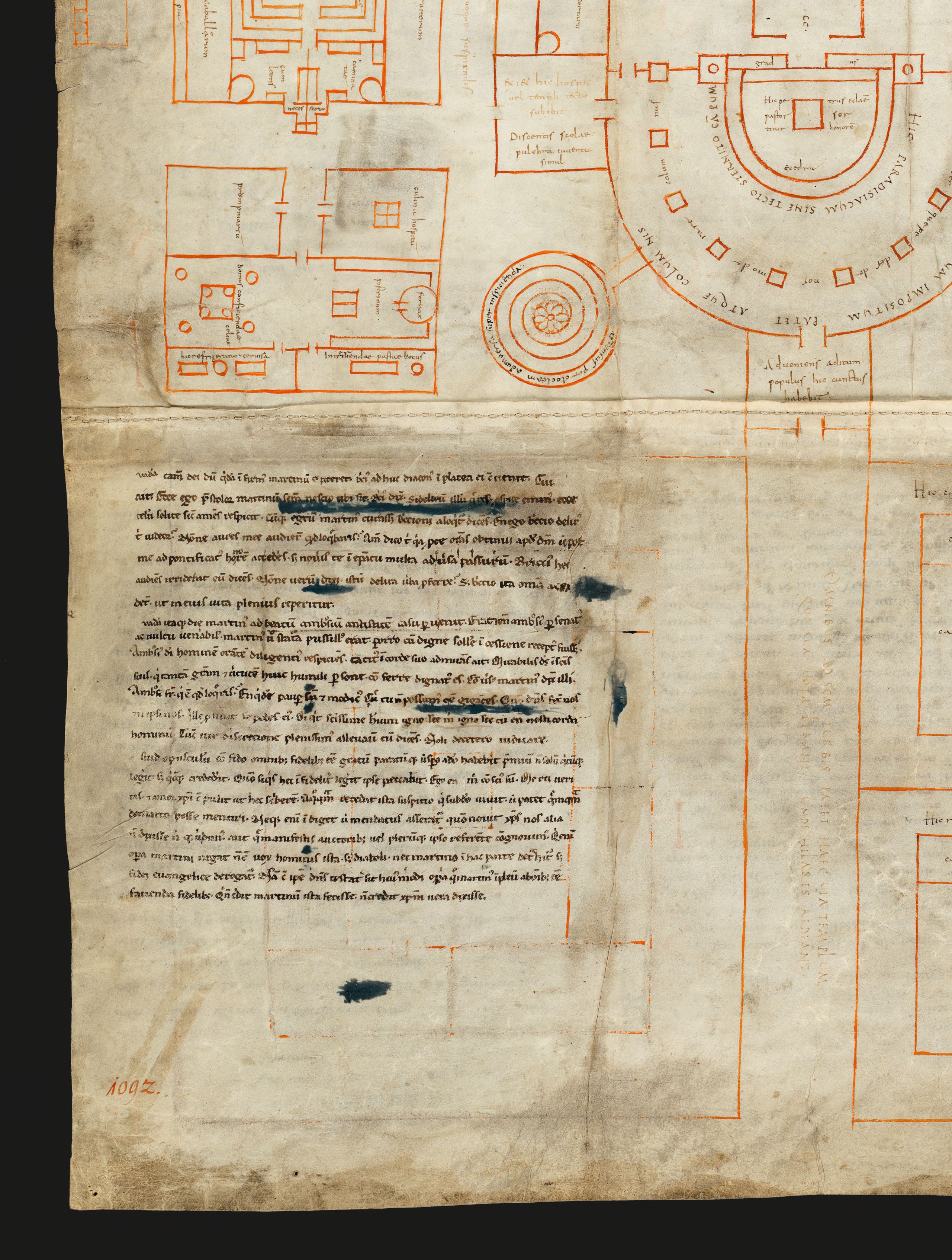 Im 13. Jahrhundert benutzte ein St. Galler Mönch die Rückseite des zu jener Zeit bereits fast 400 Jahre alten Klosterplans um die Vita des heiligen Martins aufzuschreiben. Sie hatte nicht vollständig Platz, also musste für den letzten Teil die Vorderseite hinhalten. Eine Stelle wurde also mit einem Messer freigekratzt. Die Fuktion des weggekratzten Gebäudes ist bis heute unbekannt.