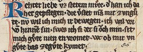 Die Lehre der alten Schriften nennt sich Paläografie. Wer nun denkt, diese Lehre ist doch sinnlos, Texte sind zum Lesen da, hat auf der einen Seite ja recht. Auf der anderen Seite will das Lesen alter Schriften auch geübt sein! Gewisse Forscher beklagen sich darüber, dass niemand mehr die Texte interpretieren und sich nur noch auf die physische Ebene der Handschriften konzentrieren will. Andere regen sich über Leute auf, die die Texte zu interpretieren versuchen, ohne das Original angeschaut zu haben. Ich lade Sie dazu ein, die folgende Passage aus dem Codex Manesse zu lesen. Es handelt sich um ein Lied des Ulrich von Singenberg und ist auf Mittelhochdeutsch geschrieben.