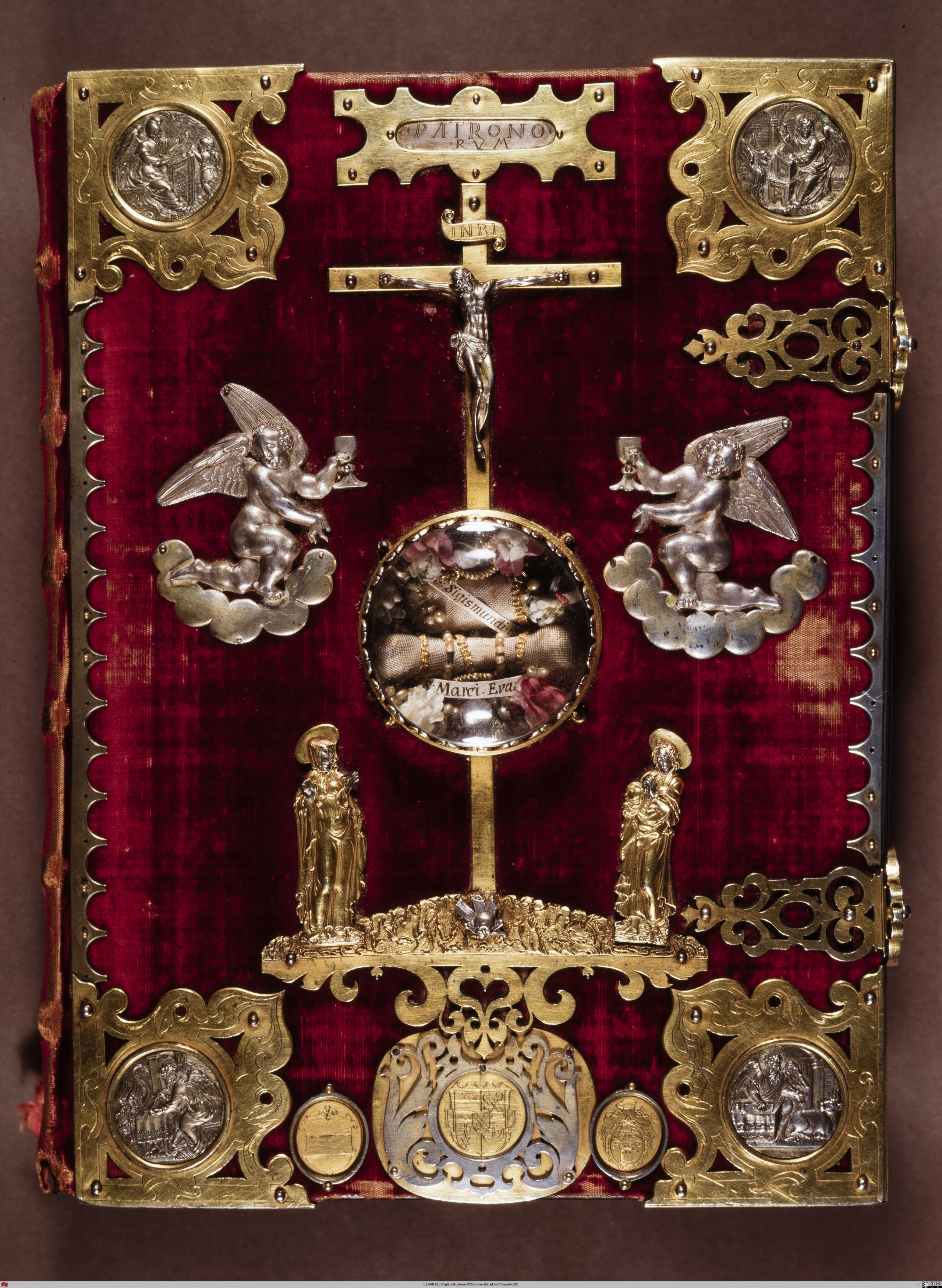Das Evangeliar Heinrichs des Löwen wurde im 16. Jahrhundert neu gebunden. Es ist in Samt gehüllt und haust Reliquien der Heiligen Sigismund und Markus. München, Bayerische Staatsbibliothek, Clm 30055, vd02. http://diglib.hab.de/mss/105-noviss-2f/start.htm?image=vd02