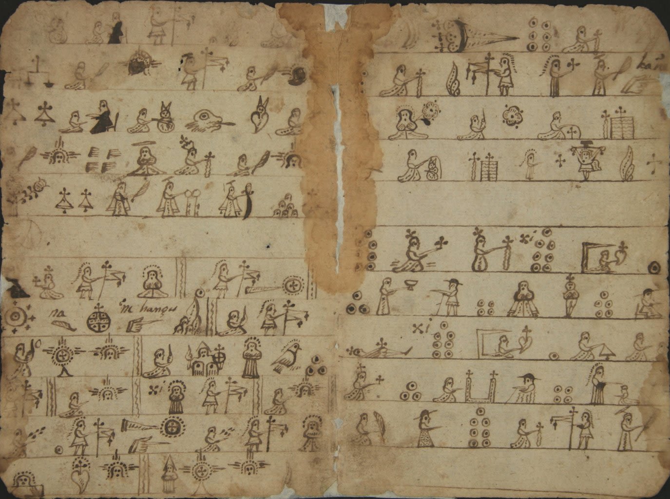 Mit Bildern Geschichten erzählen: Diese Idee gefällt den Mönchen. So können sie den grossen Teil der Bevölkerung erreichen, der die lateinischen Schriftzeichen noch nicht kennt. Es entstehen Bilderkatechismen, die bis ins 18. Jahrhundert hinein im Umlauf sind. Ein Grund für ihre weite Verbreitung könnte sein, dass die Einheimischen bei der Gestaltung mithelfen. Manche Symbole werden direkt aus den indigenen Schriften übernommen.