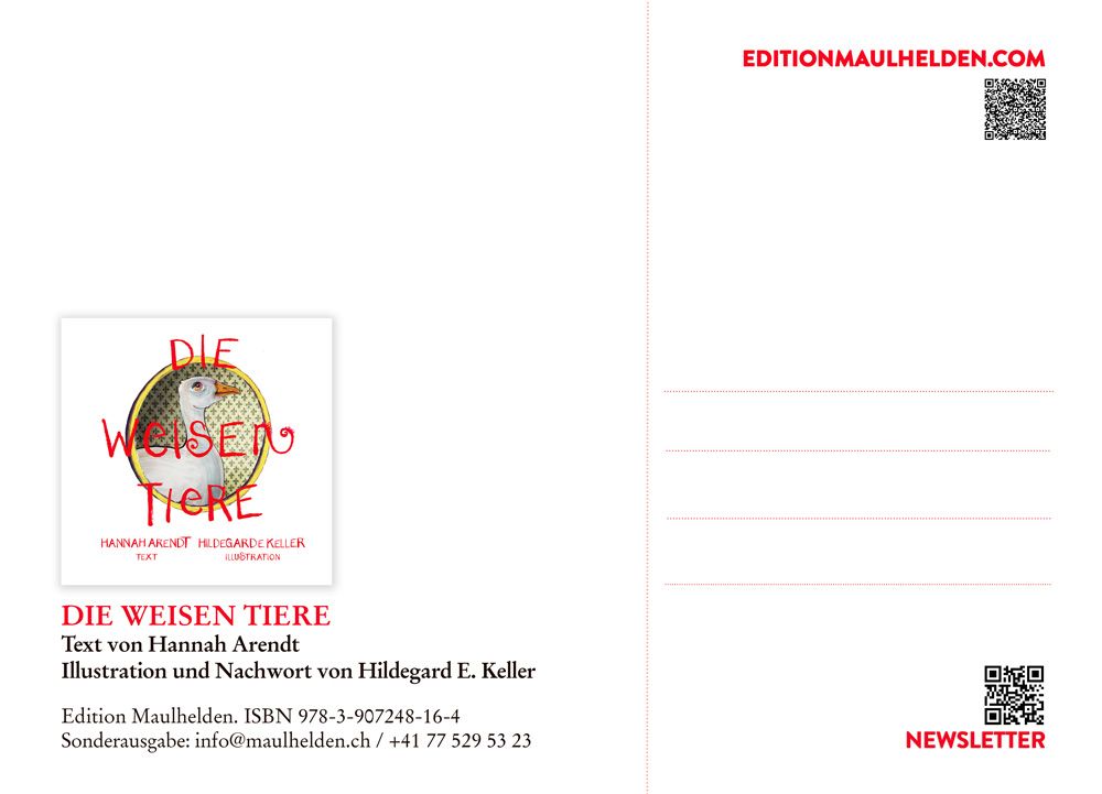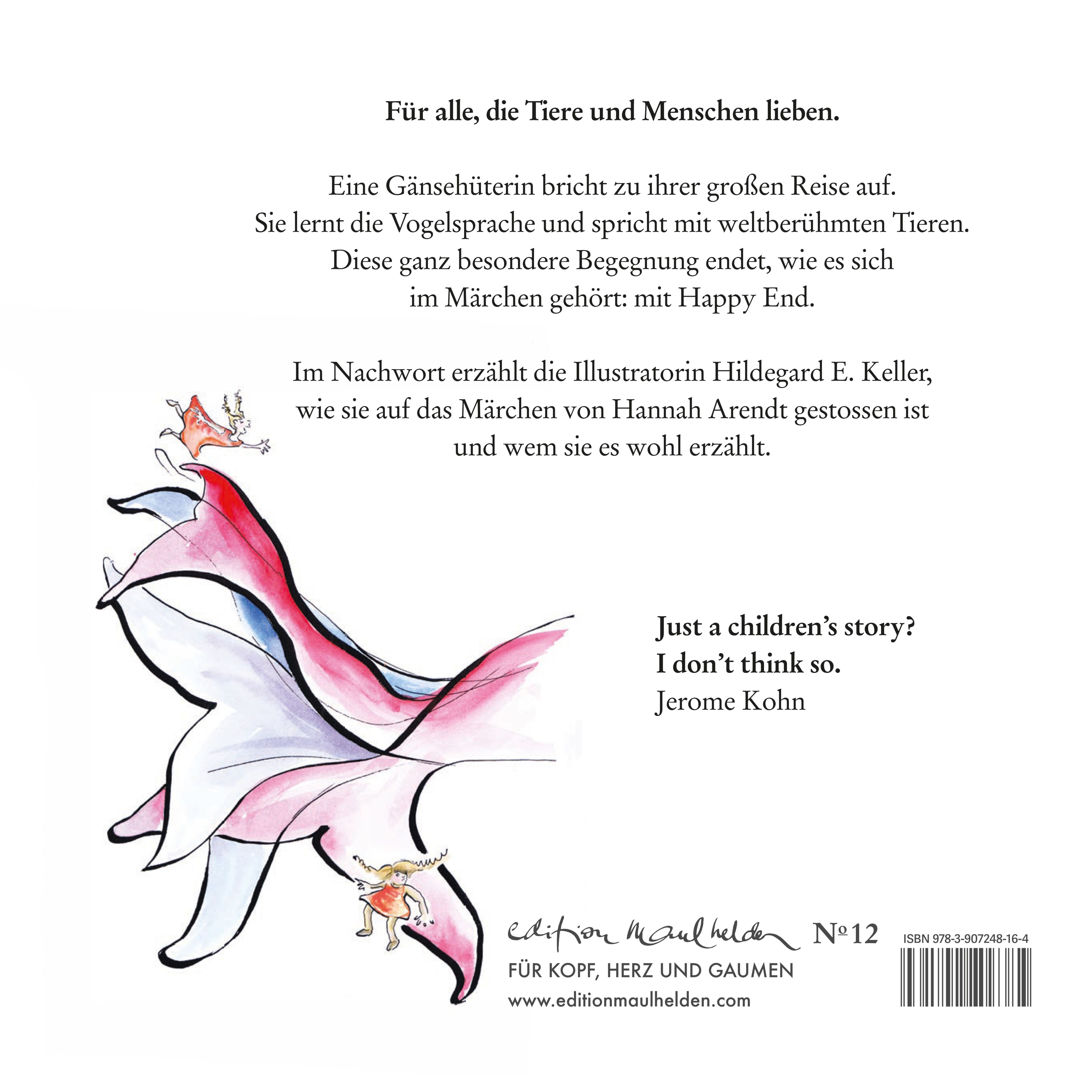 «Die weisen Tiere» ist ein Märchen, eine Tierstory, vielleicht auch eine Liebesgeschichte, die Hannah Arendt (1906-1975) für Kinder und Jugendliche geschrieben, aber wohl kaum nur für sie. Man erkennt darin schon ihre Skepsis gegenüber dem Gehorsam. «Die weisen Tiere» ist die einzige Erzählung, die von Hannah Arendt erhalten und hier erstmals integral zu bestaunen ist, illustriert von Hildegard E. Keller; sie hat den Text im Nachlass gefunden und auch das Nachwort verfasst. Am 4. Dezember 2025 jährt sich der Todestag von Hannah Arendt zum 50. Mal.