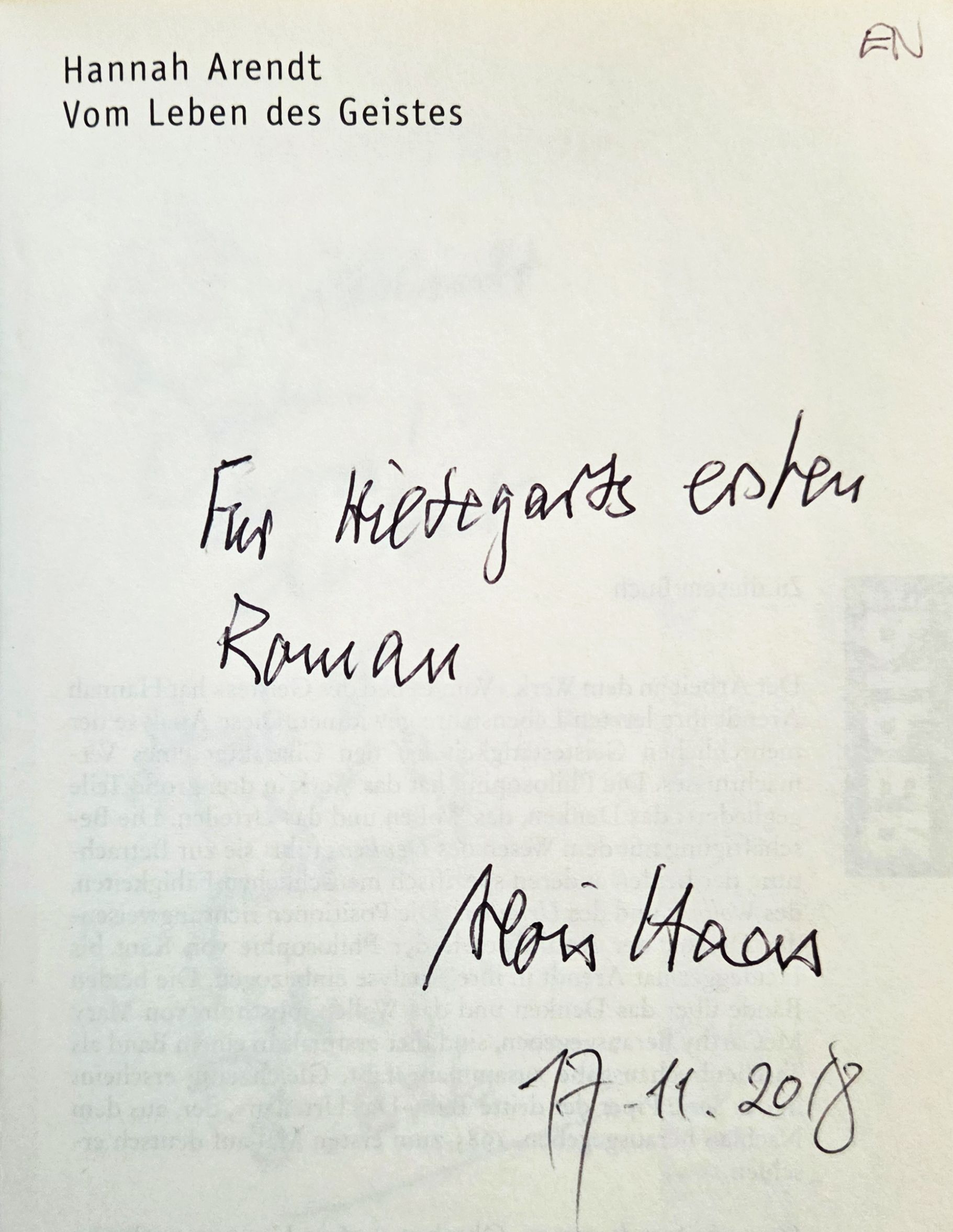 Eine wichtige Geste: Er schenkte mir seine Ausgabe VOM LEBEN DES GEISTES von Hannah Arendt und zählte dann auch zu den ersten Lesern von WAS WIR SCHEINEN. Zum letzten Mal sah ich ihn am Tag vor seinem Tod (mein Nachruf).