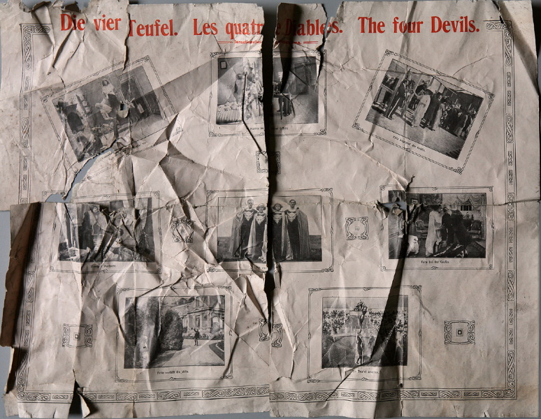 Fotografisches Bildplakat zum dänischen Stummfilm De fire Djævle (Die vier Teufel) von 1911. Regie: Robert Dinesen und Alfred Lind.