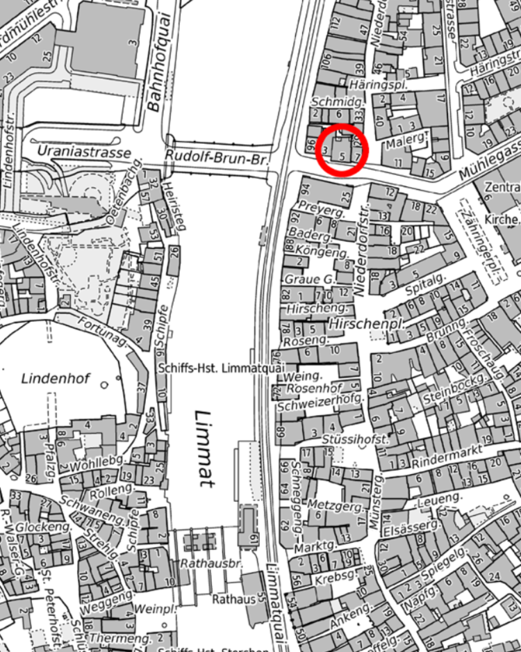 Der Obere Mühlesteg, heute bekannt als Rudolf-Brun-Brücke, erhielt seinen Namen aufgrund der dort befindlichen Mühlen, die vom 14. bis ins 19. Jahrhundert mit dem Limmatstrom betrieben wurden. Kein Wunder also, wohnten über Jahrhunderte hinweg verschiedene Müllersleute in der Mühlegasse.