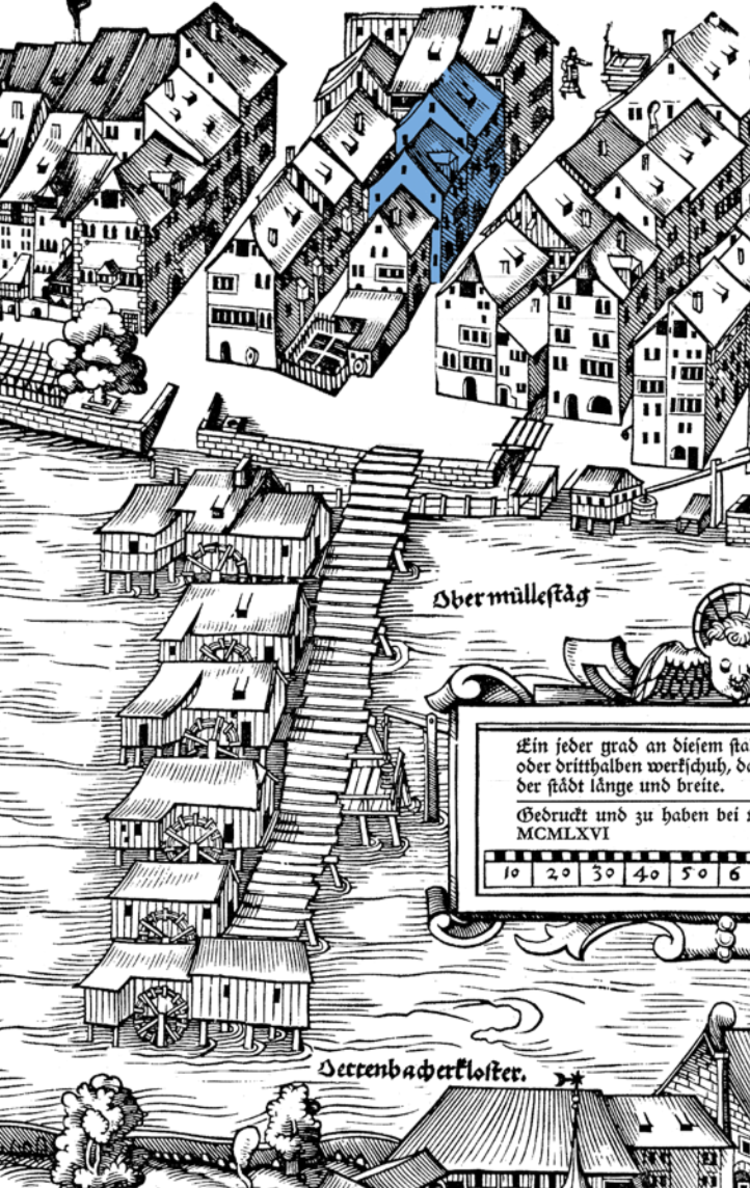 Bereits auf dem Murerplan von 1576 stehen Liegenschaften dort, wo sich später die Mühlegasse 5 (blau eingefärbt) befinden sollte.