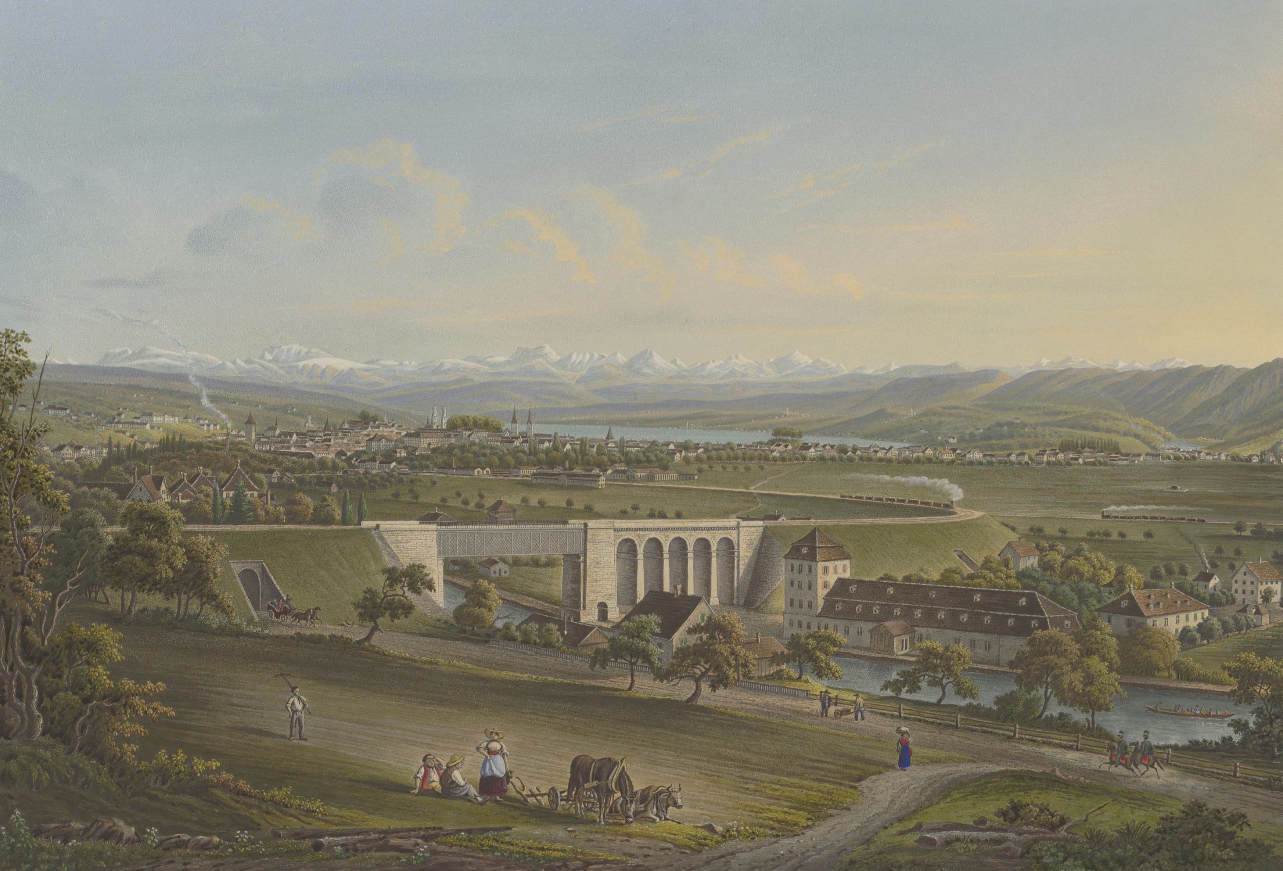 Auf dem Gemälde von Johann Baptist Isenring, dem Schweizer Maler und Fotograf, sieht man den Bahnhof in Zürich von der Limmat her. Das Bild entstand 1847 während dem grossen Eisenbahnboom.