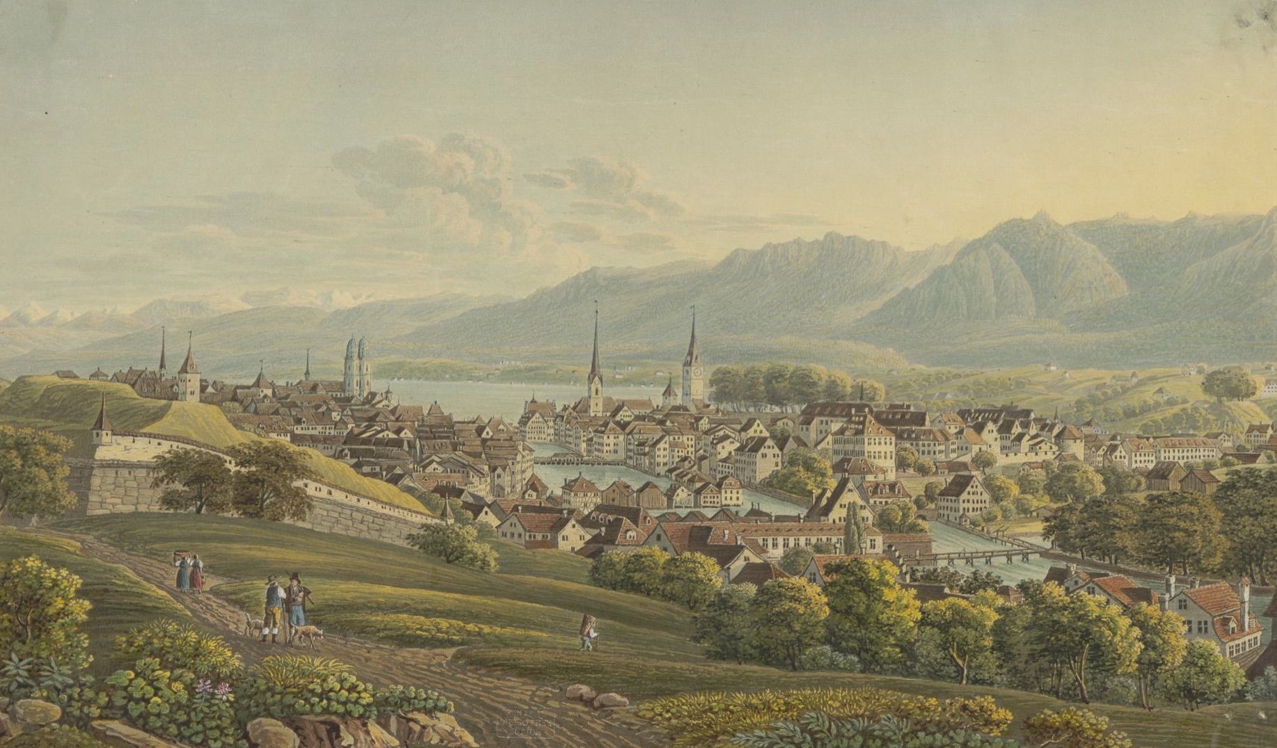 Bahnhof Zürich 1847 von der Limmat her © Johann Baptist Isenring, Wikipedia, 1847