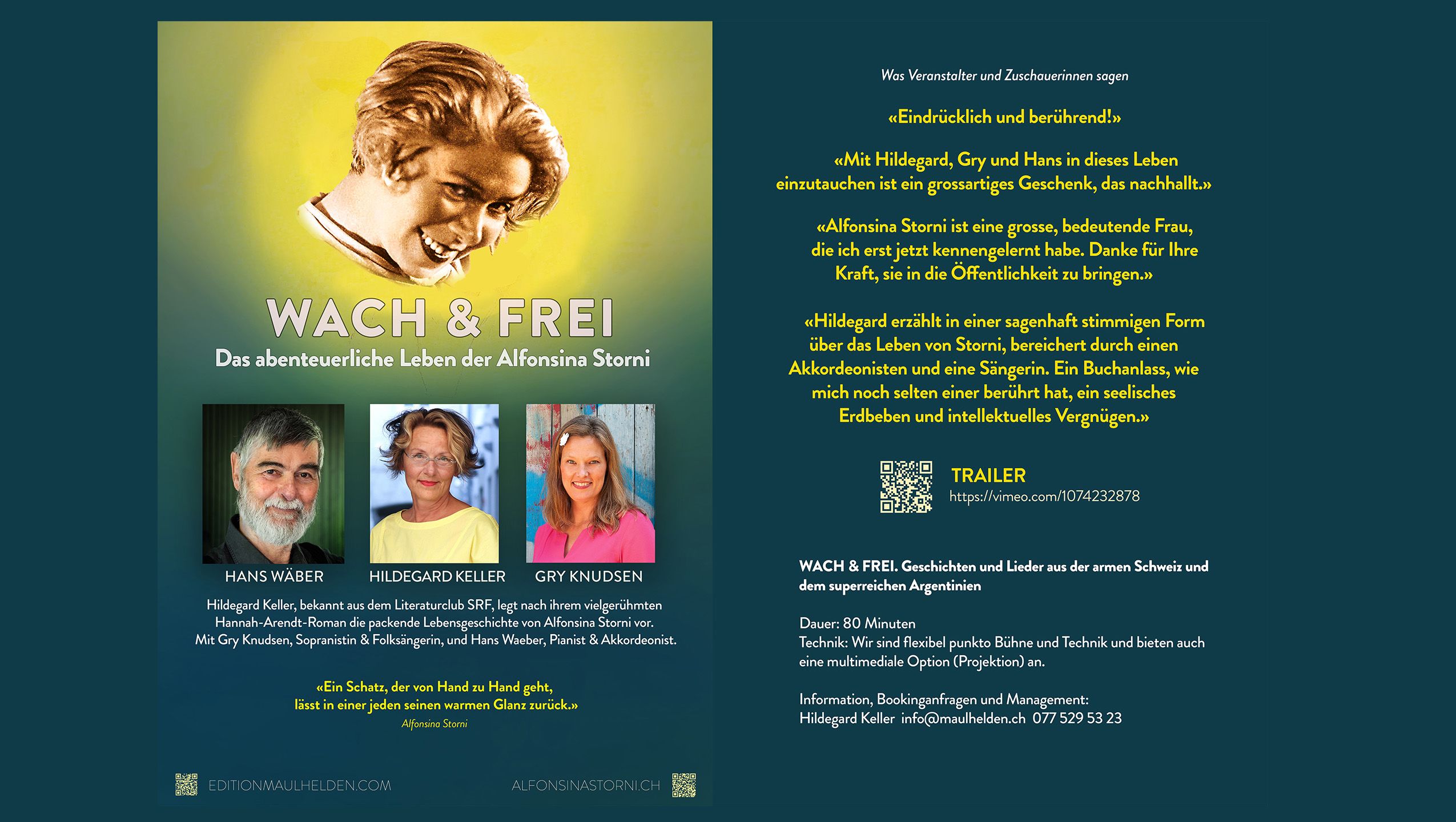 WACH & FREI ist meine jüngste Performance zum abenteuerlichen Leben der Alfonsina Storni. So heissen auch beiden Biografiebände, die ich für die Edition Maulhelden geschrieben und gestaltet habe. Die Summe von fünfzehn Jahren, mit der wir seit Oktober 2024 auf Tournee sind.