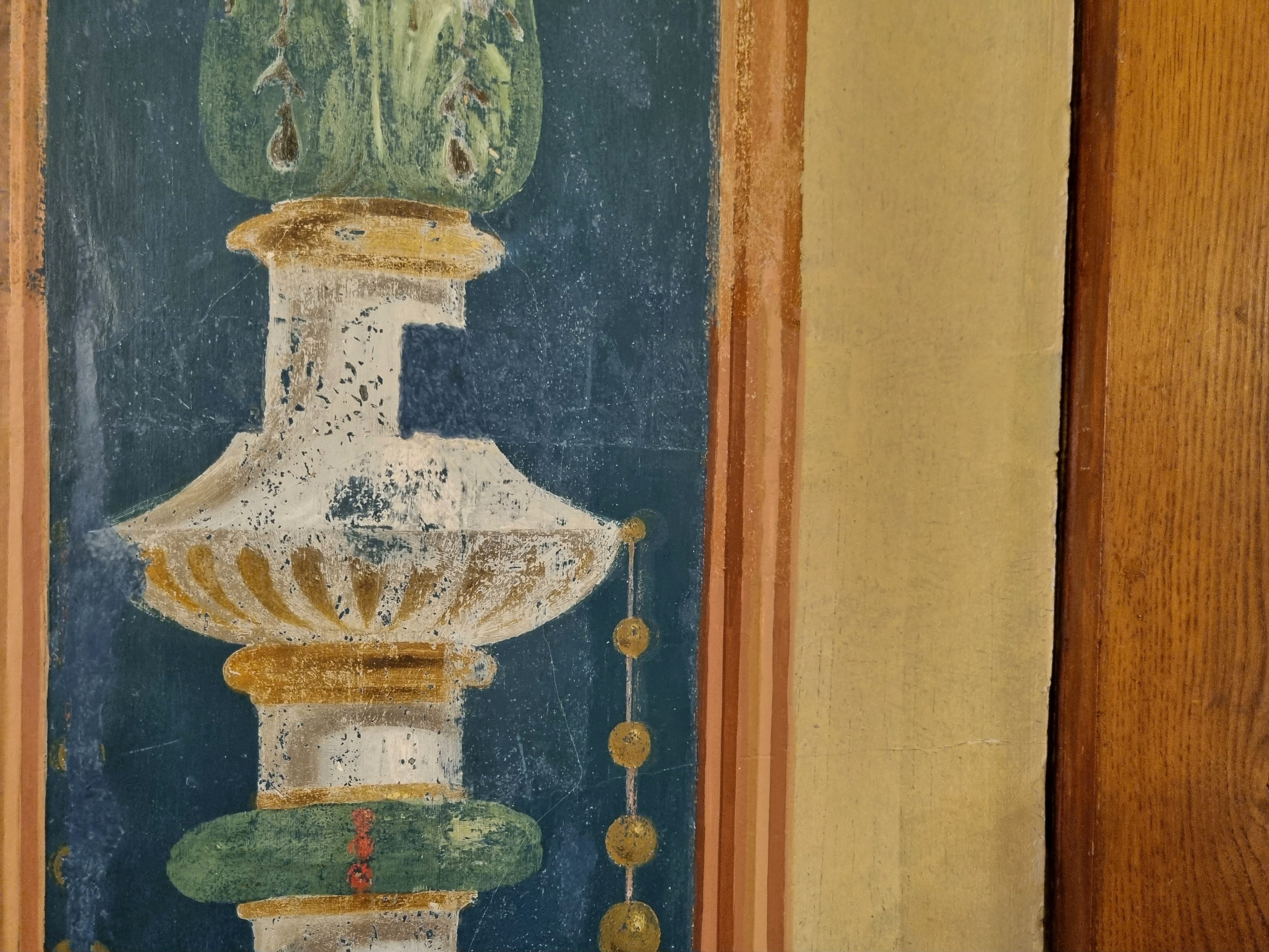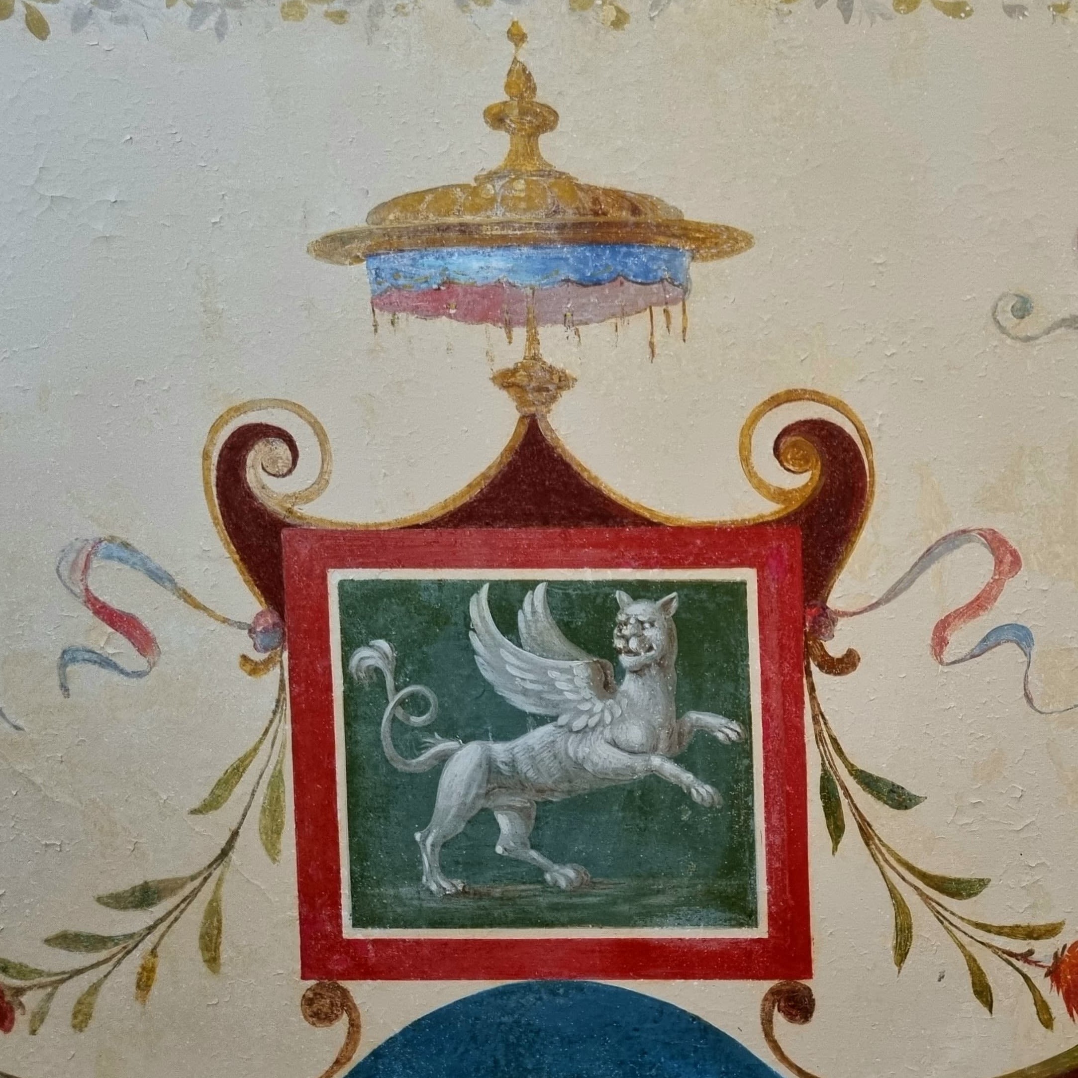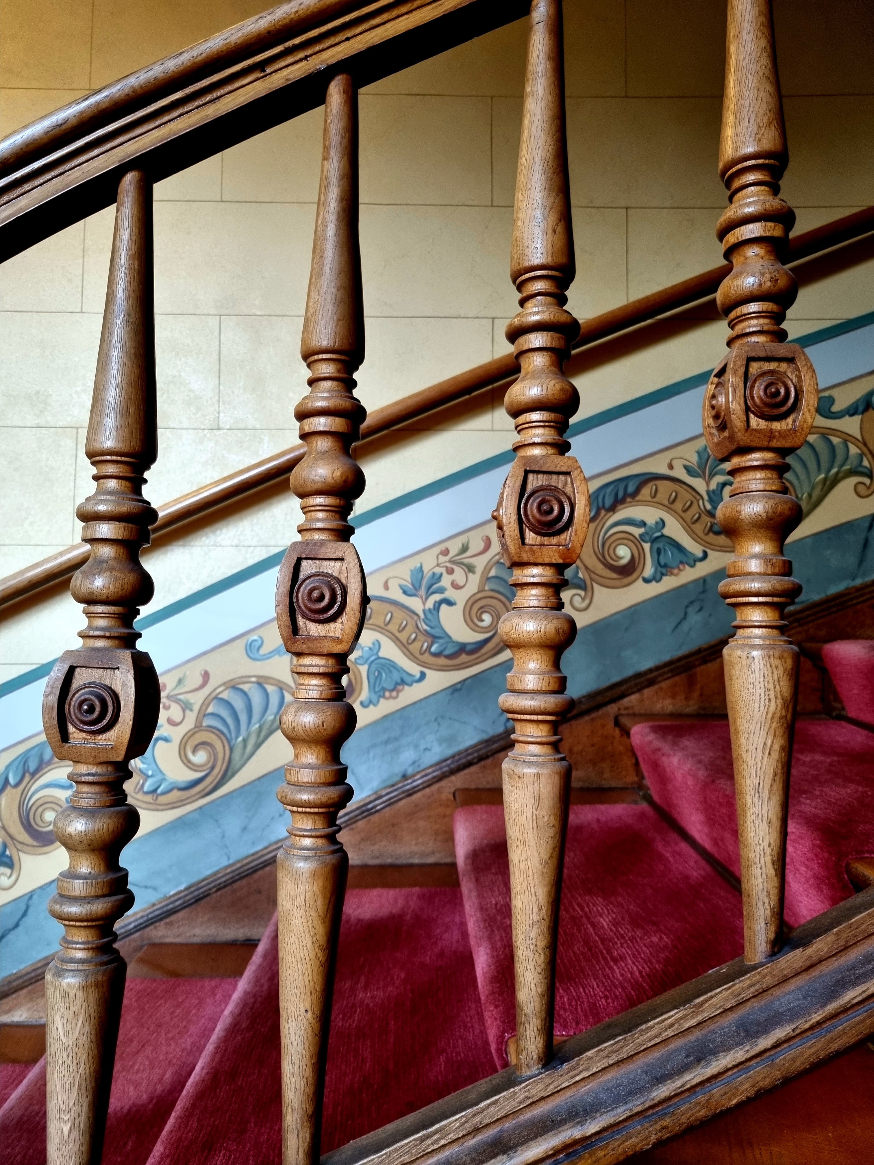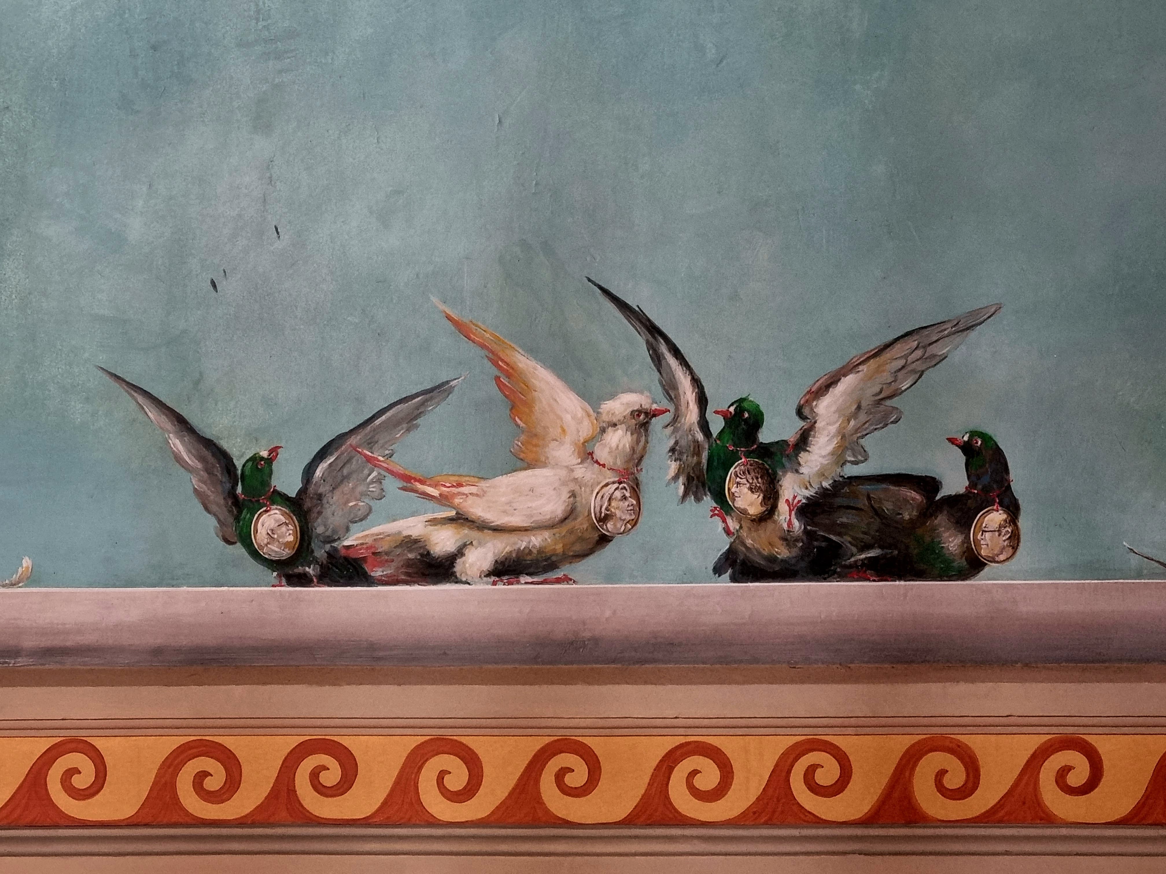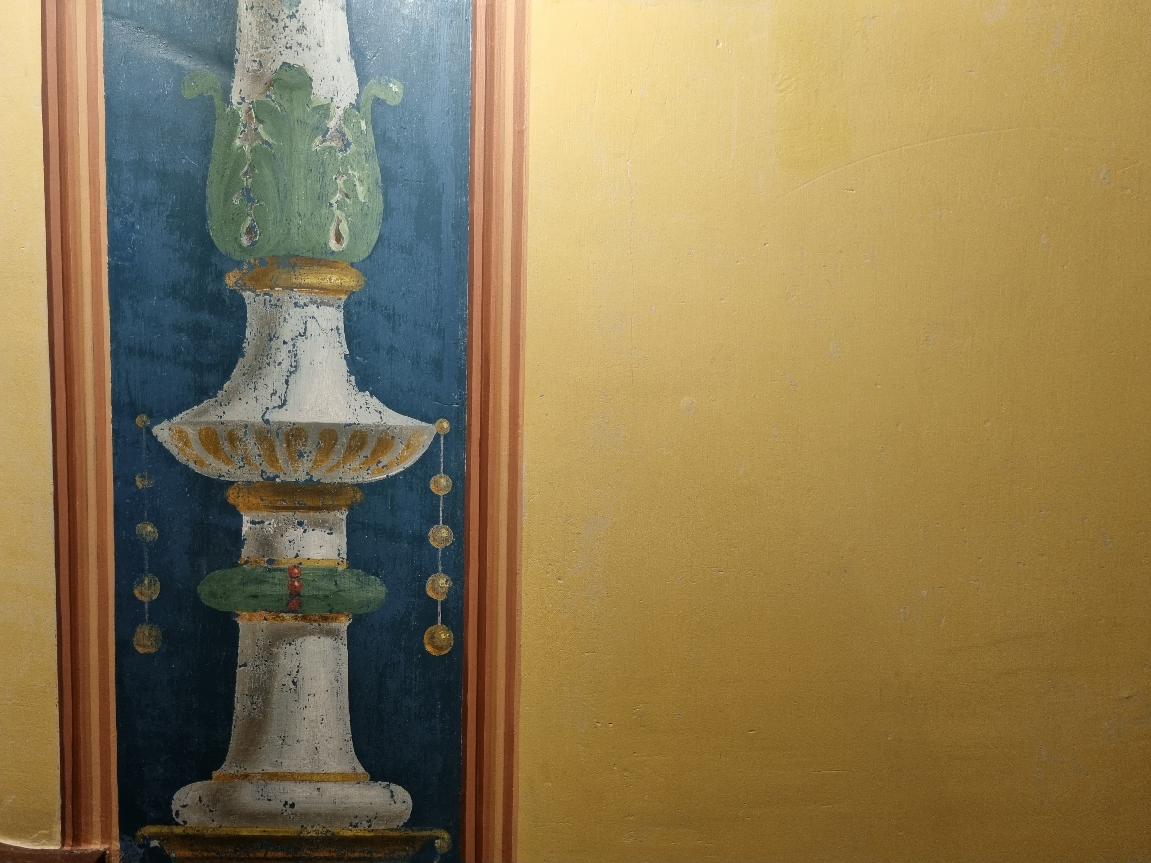 Zusammen erklimmen wir die Treppe hinauf ins Erdgeschoss. Der schwere Teppich lässt unsere Schritte verstummen und wir fühlen uns ganz klein in dieser Prachtvilla. Wir versammeln uns in einem grossen Zwischenraum: Die Wände und Decken sind geschmückt mit prunkvollen Bemalungen. Säulen zieren die Wände – auf den ersten Blick scheinen sie echt, doch sie sind nur aufgemalt: sogenannte Trompe-l’œil-Dekorationen. Einige der Malereien sehen unvollständig aus ... Weshalb wohl?