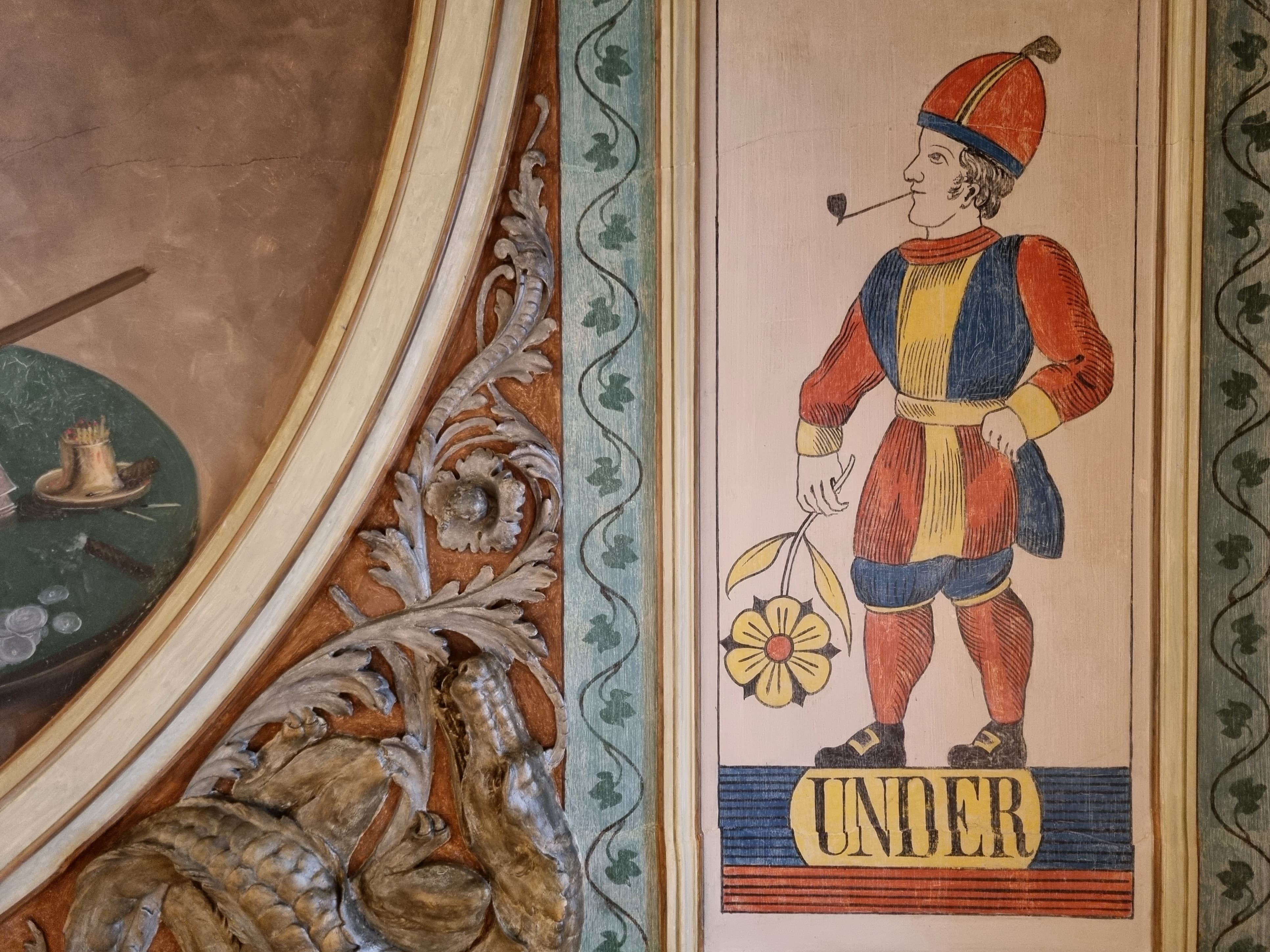 Ich betrete die Eingangshalle und werde unweigerlich von der Deckenbemalung in den Bann gezogen: Neben einem Schachbrettmuster mit Schachfiguren sind auch Schweizer Jasskarten zu sehen – solche Motive sind eine Seltenheit in der Villa, wie wir bald noch sehen werden. Wie Hans Guck-in-die-Luft bewege ich mich durch das Zimmer auf die Reception zu.