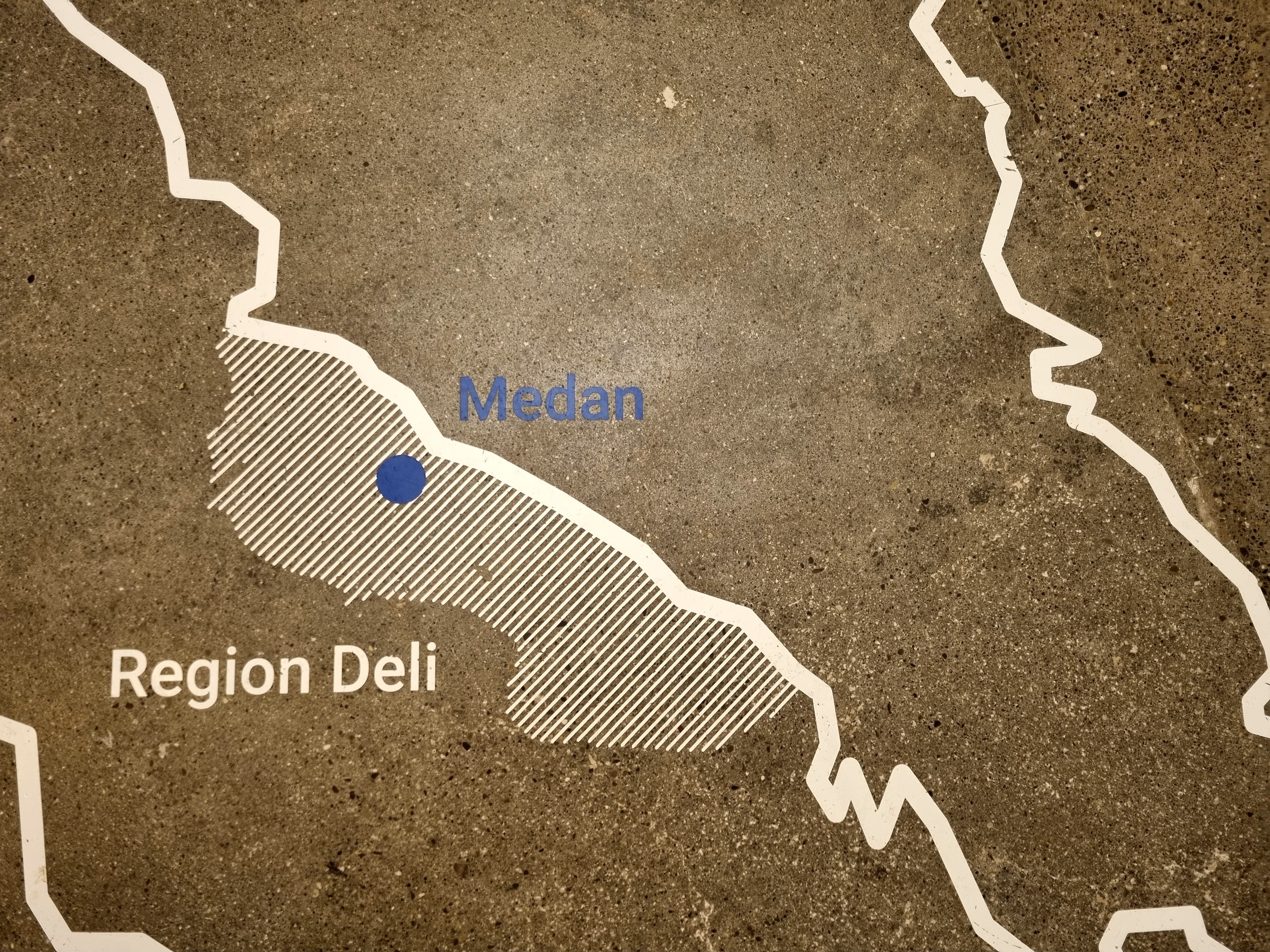 Im nächsten Raum ist die Decke schlicht gestaltet, dafür zieht nun der Boden meinen Blick auf sich: Wir stehen mitten im Indischen Ozean, zwischen Malaysia, Java und Sumatra. Hier finden wir erste Hinweise darauf, dass die Villa eine Verbindung zu dieser Insel aufweist. Der Kaufmann Carl Fürchtegott Grob hat in den 1880er Jahren in Patumbak im Nordosten von Sumatra mit Tabakplantagen ein Vermögen verdient, damit liess er 1883 die Villa Patumbah von den berühmten Zürcher Architekten Alfred Chiodera und Theophil Tschudy erbauen. Zwei Jahre später steht die Villa und demonstriert eindrücklich, wie junge Schweizer Männer im Ausland sehr schnell zu viel Geld kommen konnten. Bei seiner Rückkehr nach Zürich war er einer der fünf reichsten Bürger der Stadt Zürich.