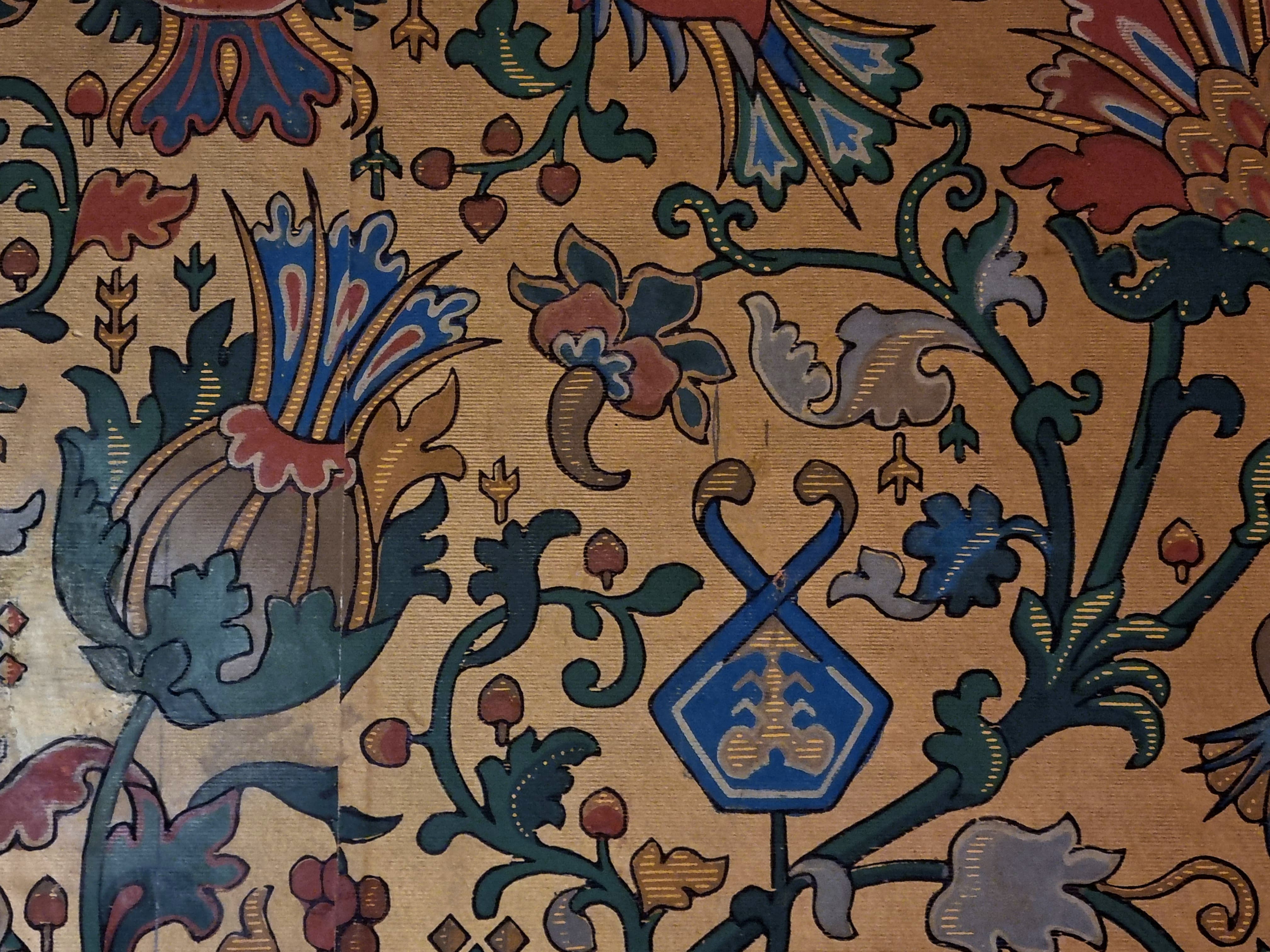 Die Holzstuckaturen rahmen die Bilder an der Decke und die Tapeten nehmen ein Motiv wieder auf: Überall sind Granatäpfel. Motivisch verbinden sie Decke und Wände, jeder Raum folge einem eigenen Konzept. Weshalb gerade der Granatapfel gewählt wurde, kann mir der Guide nicht beantworten. Der Granatapfel hat eine vielfältige religiös-kulturelle Symbolik; so steht er unter anderem für Leben, Fruchtbarkeit und auch Überfluss. Ist dies also ein Wink mit dem Zaunpfahl, fragen wir uns, während wir inmitten dieses Prunks stehen.