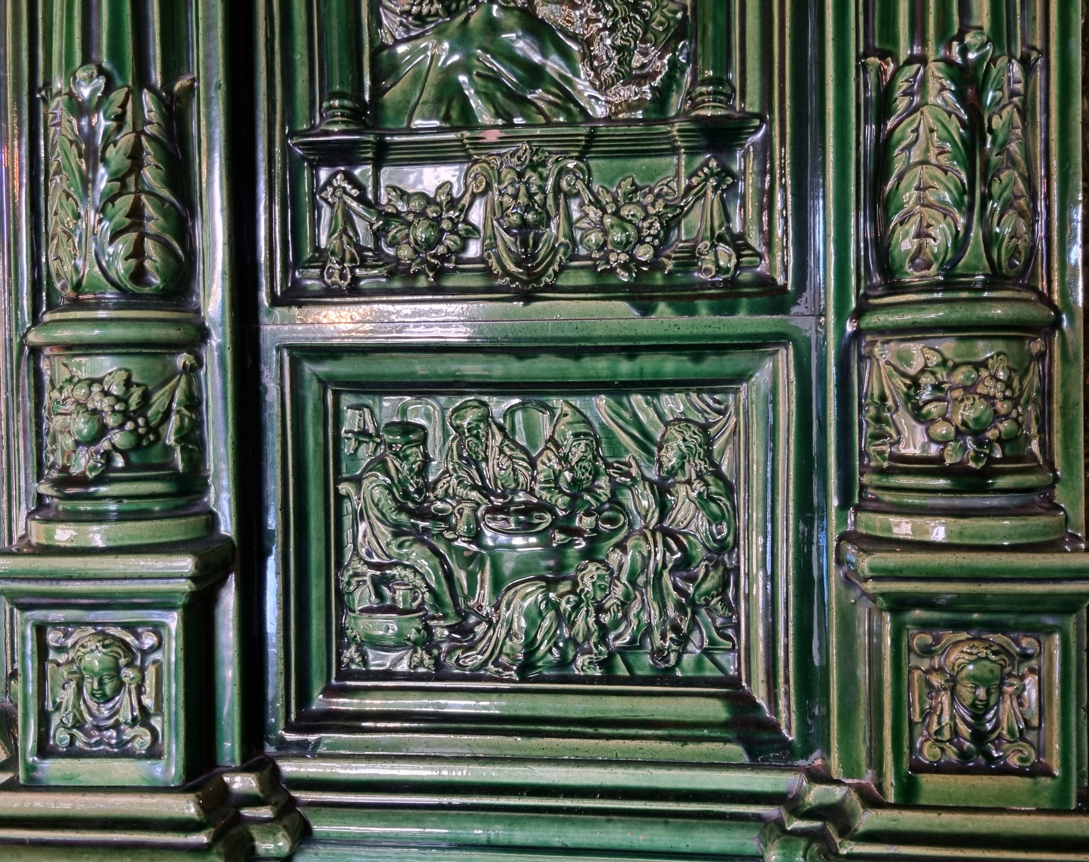 In einer Ecke steht ein Monstrum von einem Kachelofen. Bei genauerem Betrachten erkenne ich Menschen, die um einen bedeckten Tisch herum sitzen. Verschiedene Früchte verzieren den Ofen. Hut ab den Architekten!