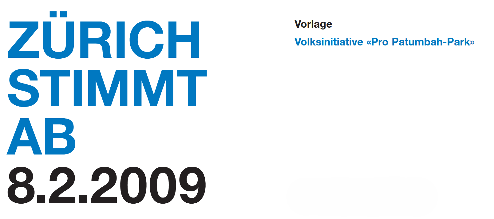 Stadt Zürich: Zürich stimmt ab, 08.02.2009, Vorlage Volksinitiative «Pro Patumbah-Park». file:///C:/Users/Startklar/Downloads/Abstimmungszeitung_1_09_Web-1.pdf. Abgerufen am 12.12.2024.