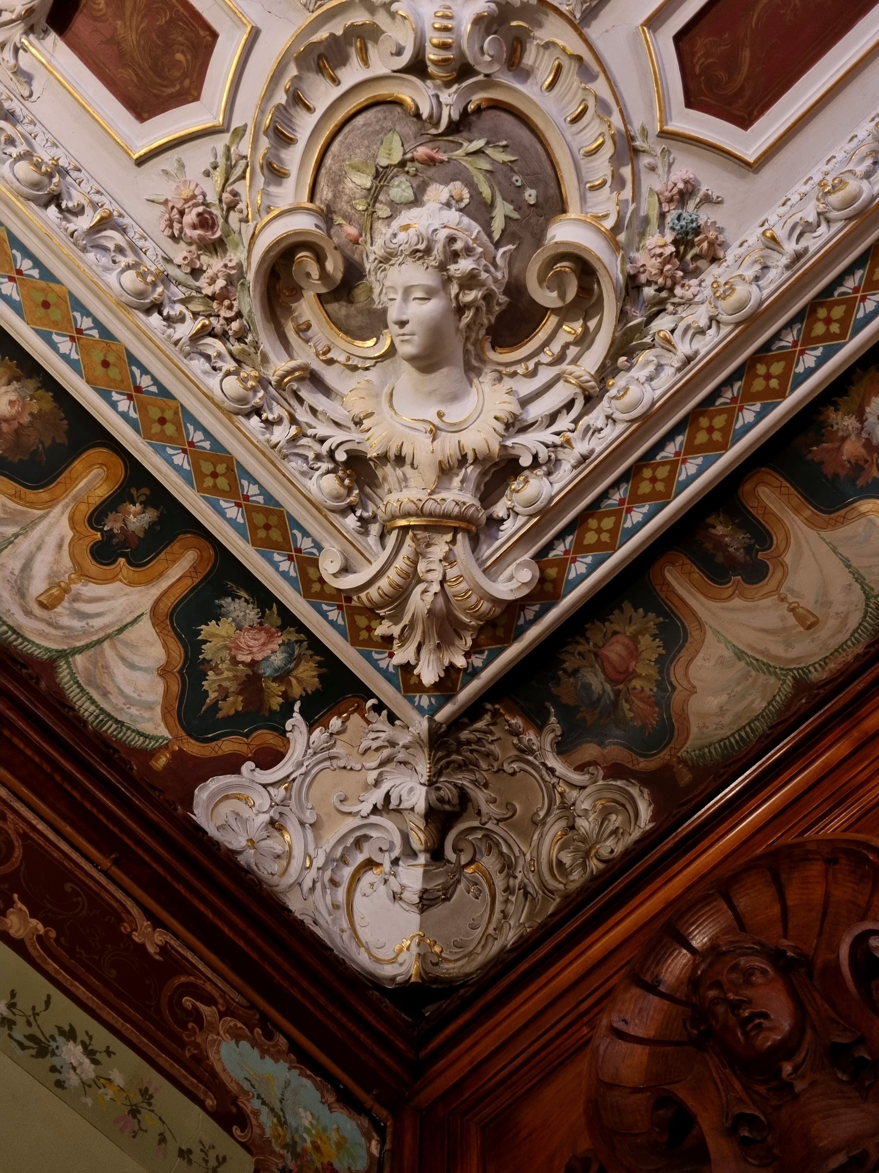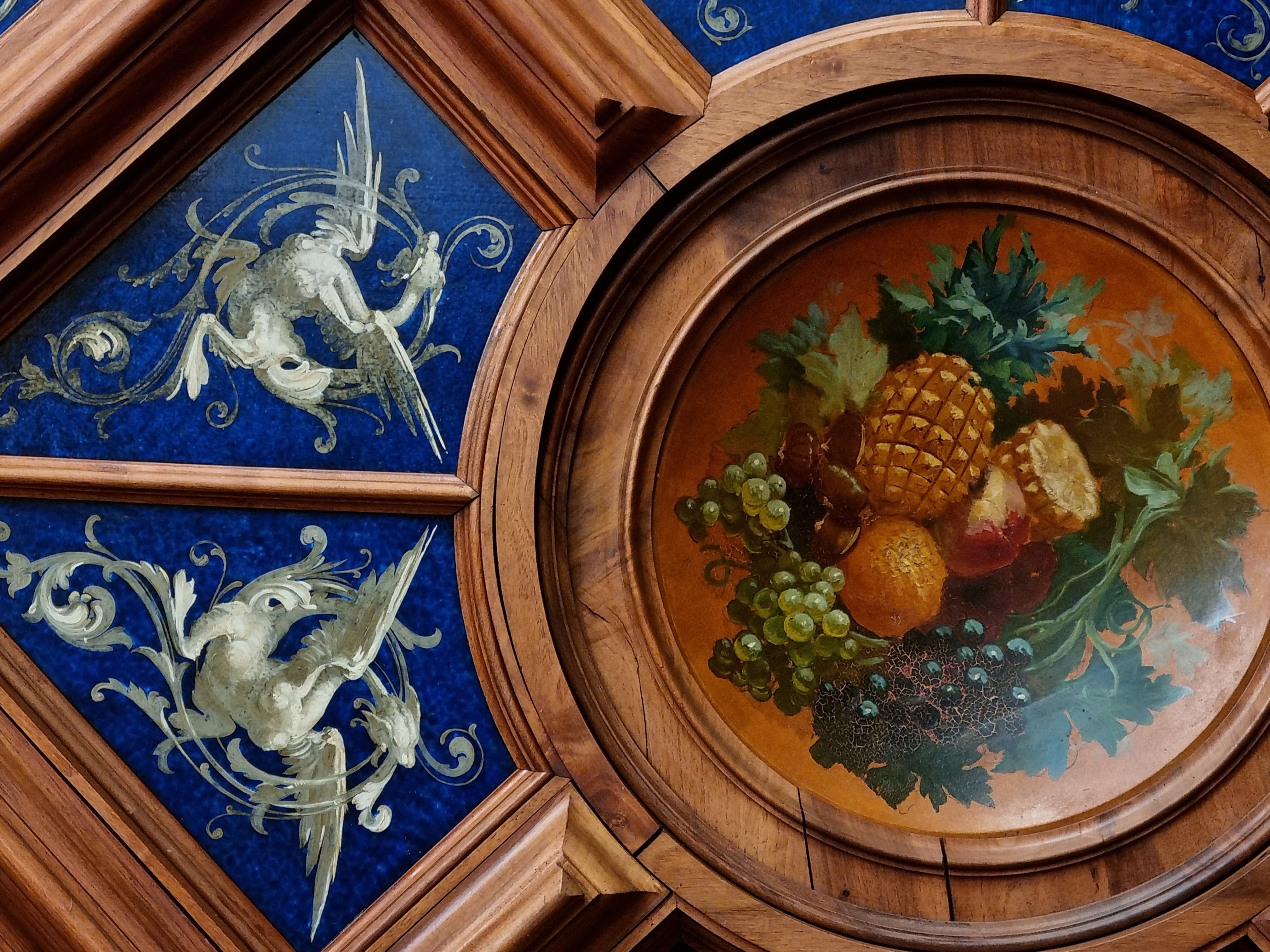 Der Salon diente früher als Esszimmer. Anstelle von Hotdogs wurden hier wahrscheinlich auch einige exotische Früchte verspeist, denn an der Decke sind nicht nur Granatapfel, sondern auch Ananas, Trauben und Orangen zu finden.