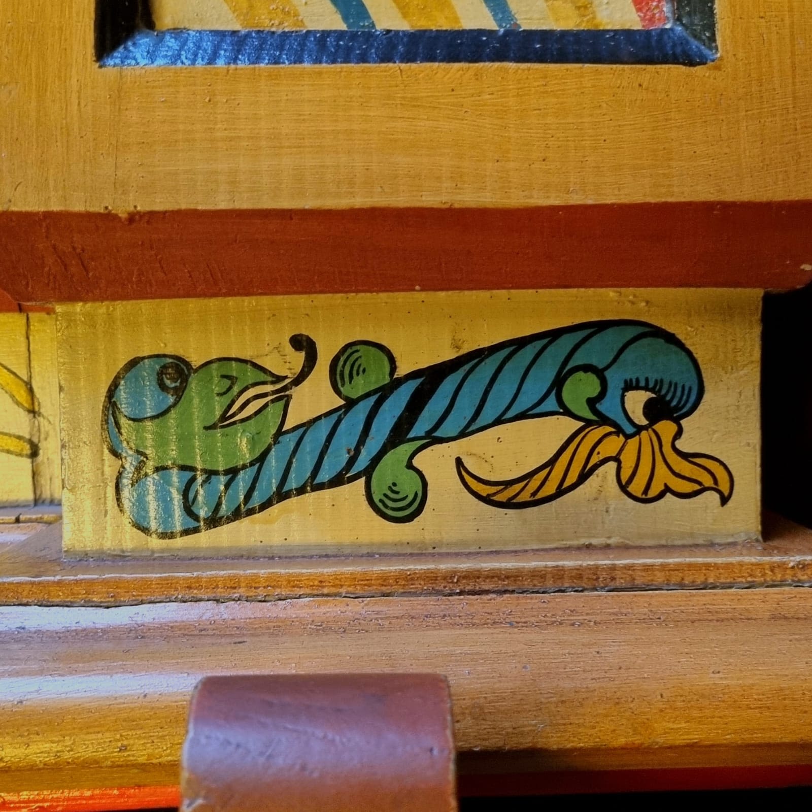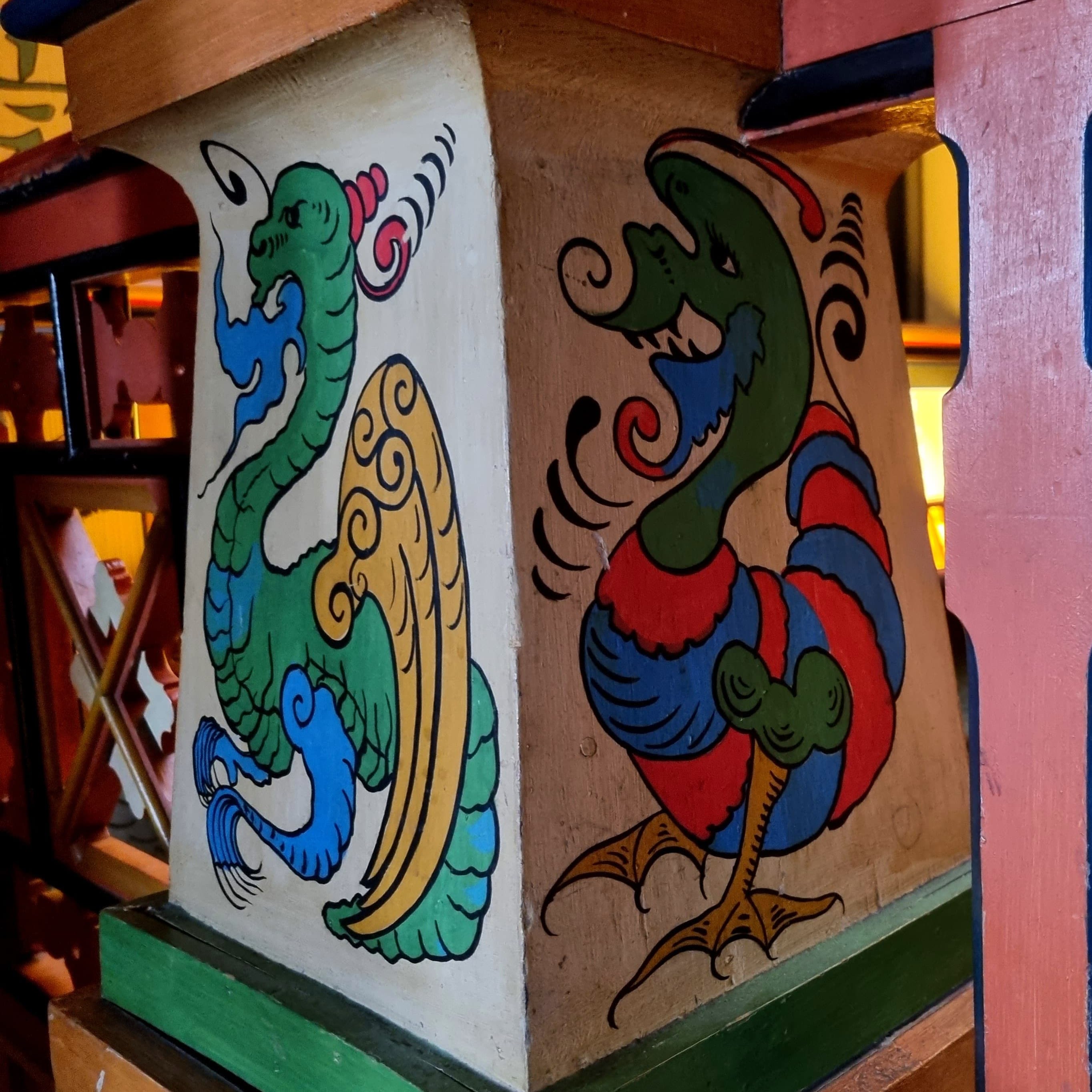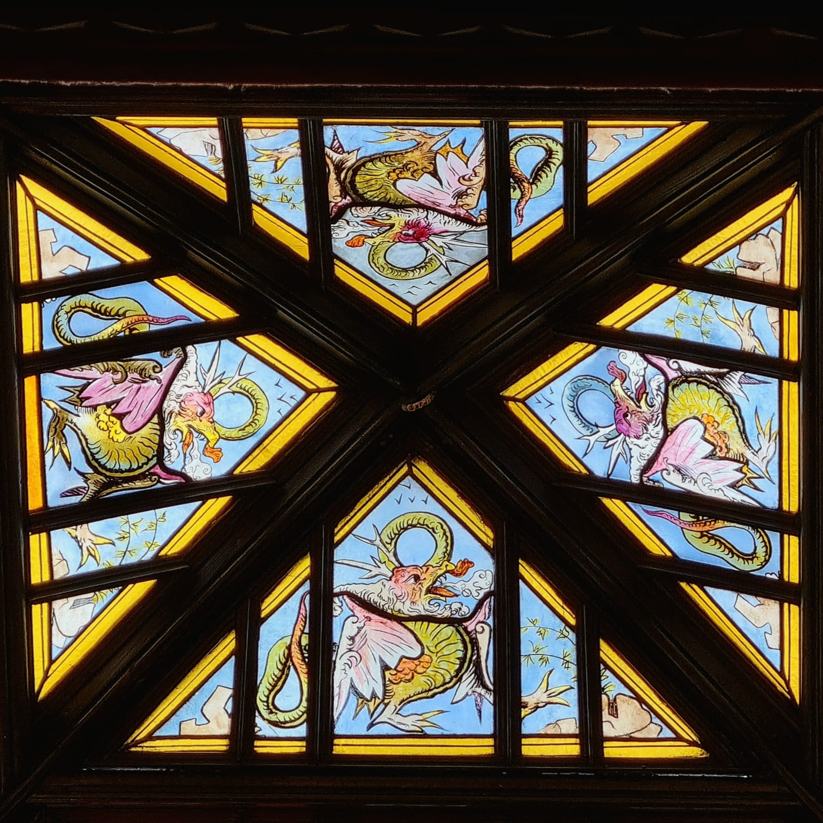 Neben exotischen Tieren und Fabelwesen sind auch Mischgestalten in aller Farbenpracht auszumachen. Die asiatischen Glücksdrachen, die ganz oben in der Kuppel fliegen, erregen meine Aufmerksamkeit. Es sind dieselben Drachen, die man auch durch das Loch im unteren Stock erspähen kann. Es scheint, als hätte Grob Wert darauf gelegt, dass diese Glücksbringer ihre Macht über dem ganzen Haus entfalten können und von ganz oben über alle Bewohnenden der Villa wachen.