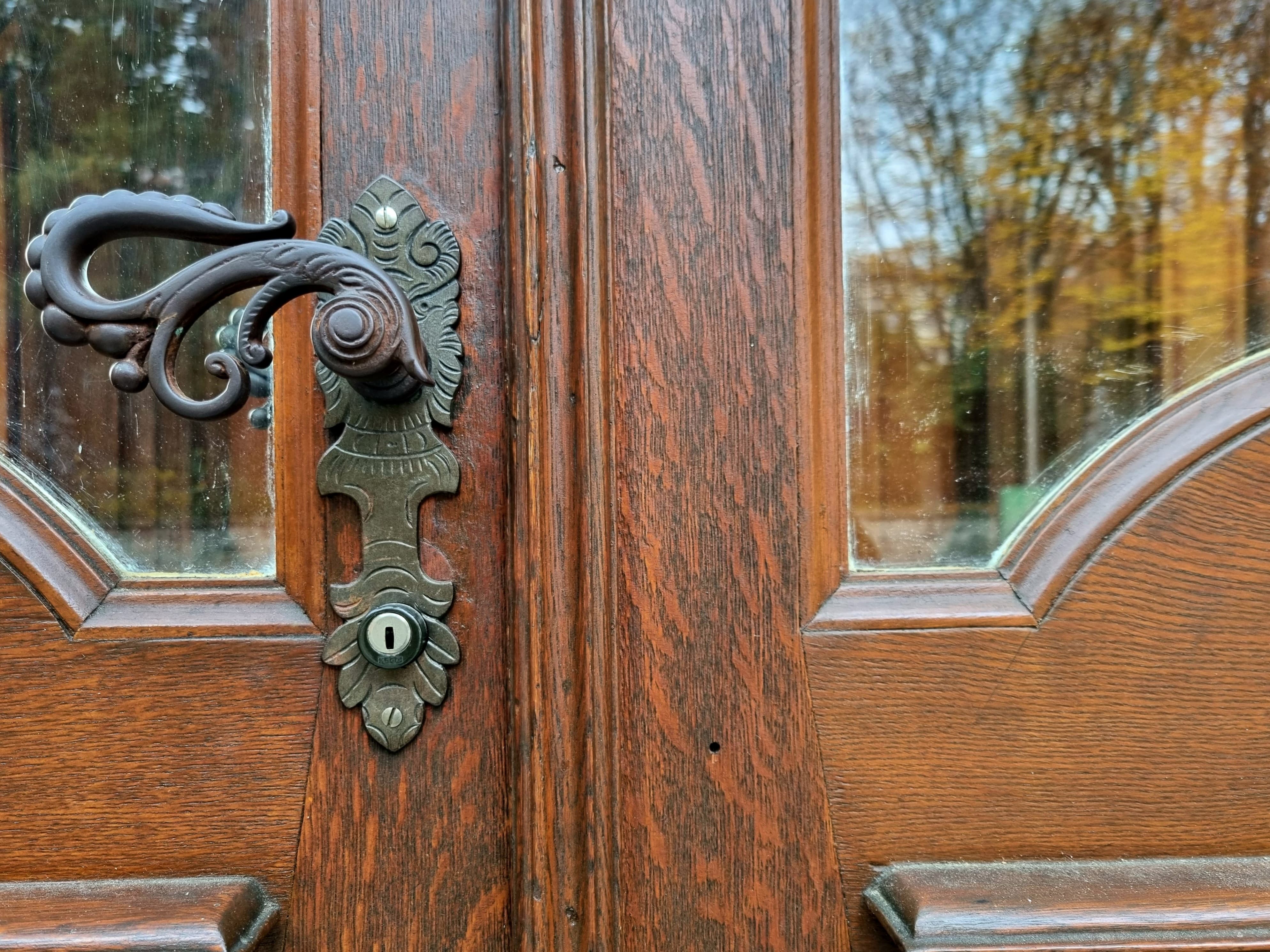 Um das Damenzimmer auf der rechten Seite des Salons zu betreten, müssen wir durch die Tür, die aus massivem Tropenholz aus Patumbah gemacht ist – dieses ist sonst nirgends im Haus zu finden. Die Tür weist das Datum der Fertigstellung der Villa Patumbah auf, beschützt von einem Engel.