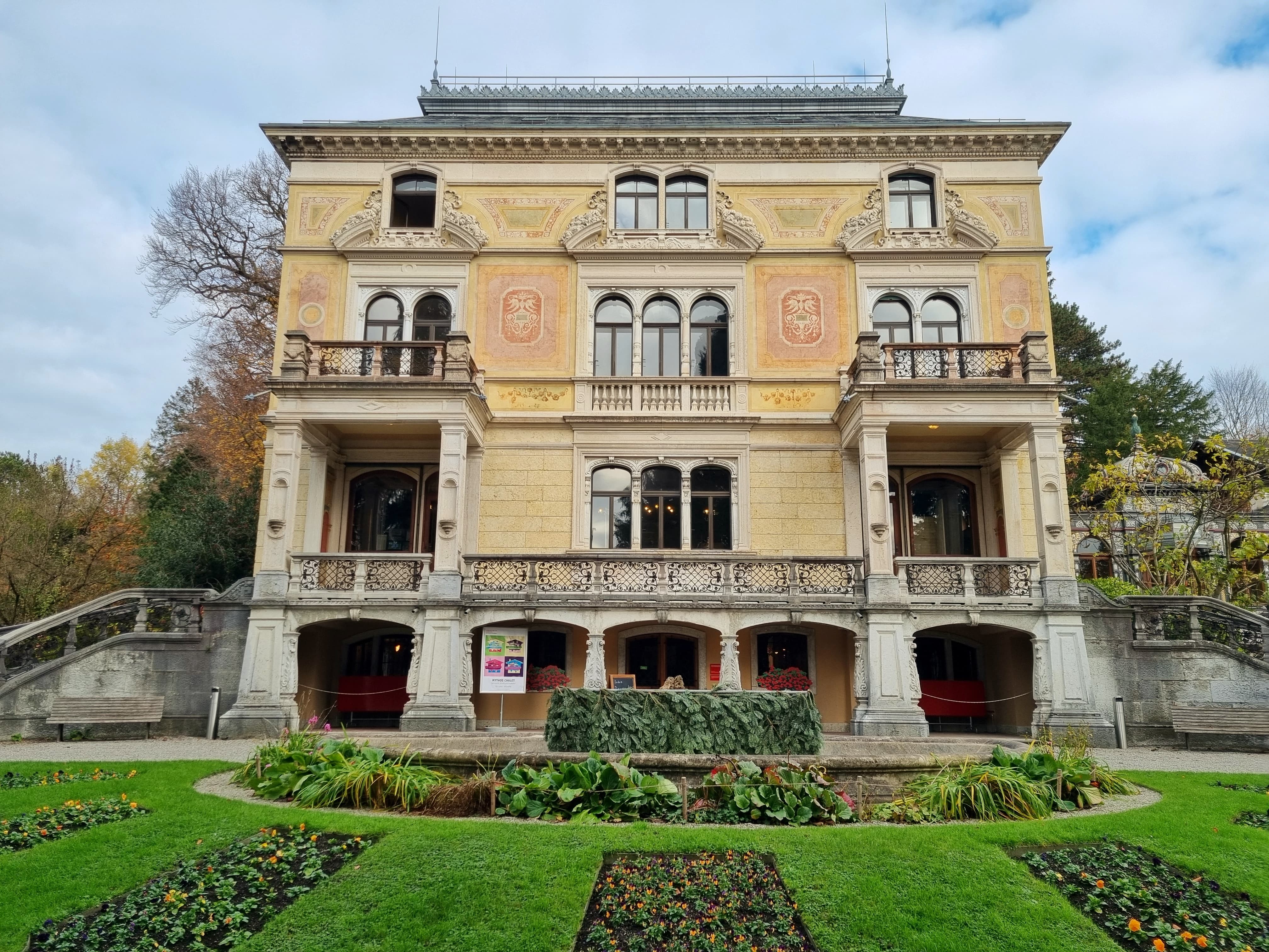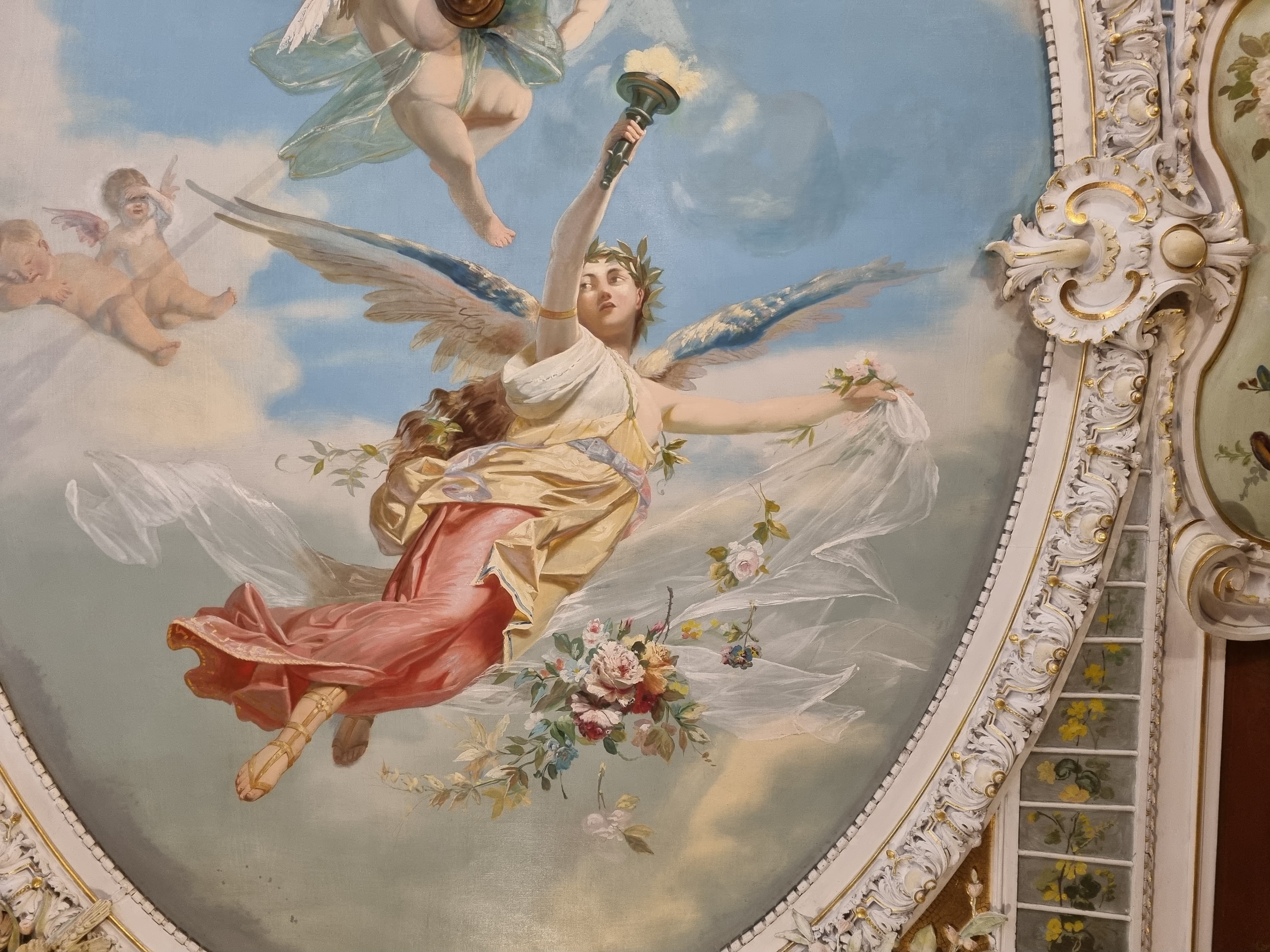 Das Frauenzimmer im Stil des Rokokos steht in starkem Kontrast zum Herrenzimmer: Büsten säumen die Wände und Decken, Pastelltöne verleihen dem Zimmer etwas Träumerisches. Die Tapeten sind aus gewobenem Stoff, verziert von Stickereien. Blumen fliegen um die Engel, die an der Decke schweben. Die Leichtigkeit, die durch die Figuren und Farben evoziert wird, wird von der Fülle überrumpelt und beinahe zunichtegemacht. Da helfen auch die grossen Fenster nicht mehr viel. Beim Verlassen des Raumes atme ich tief durch. Die Villa treibt die Fülle auf die Spitze, was erschöpfend sein kann.
