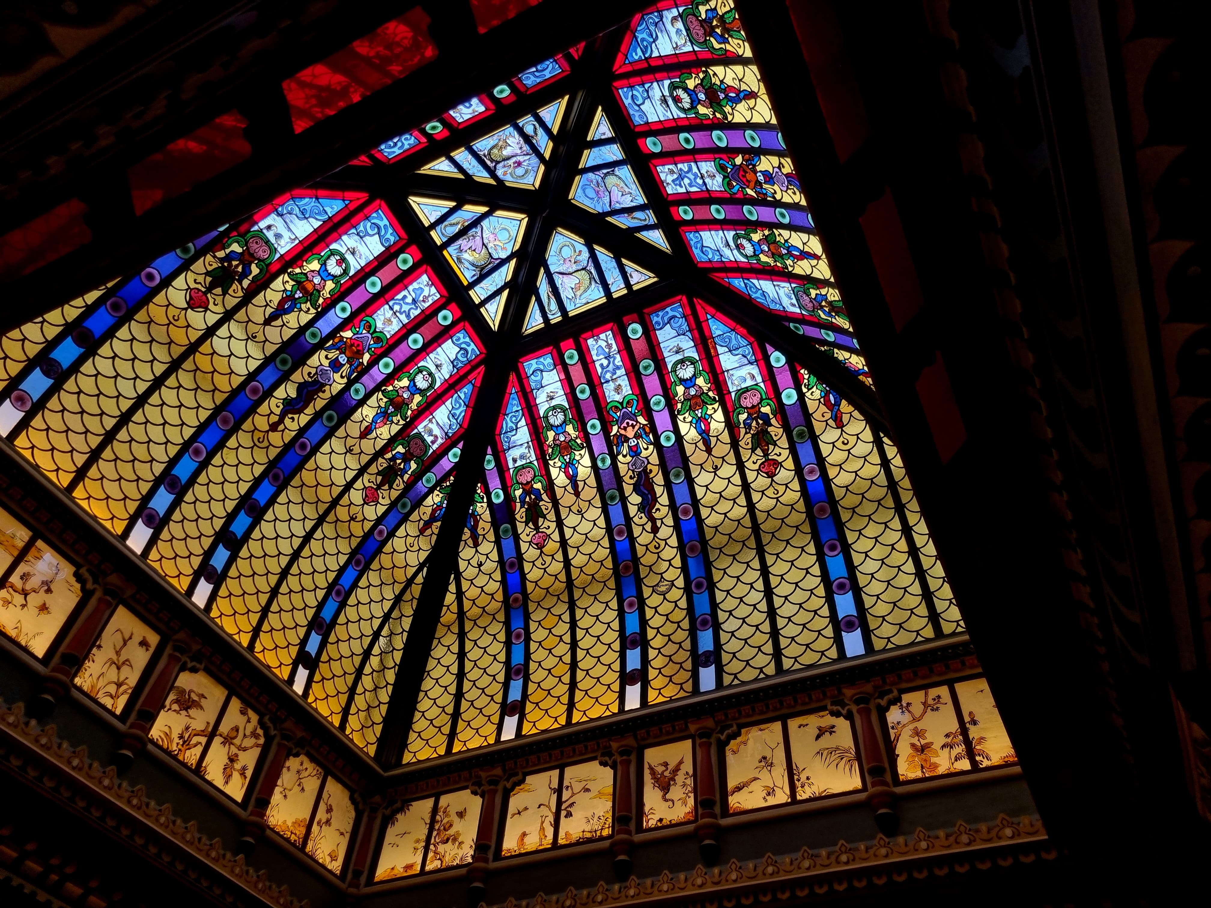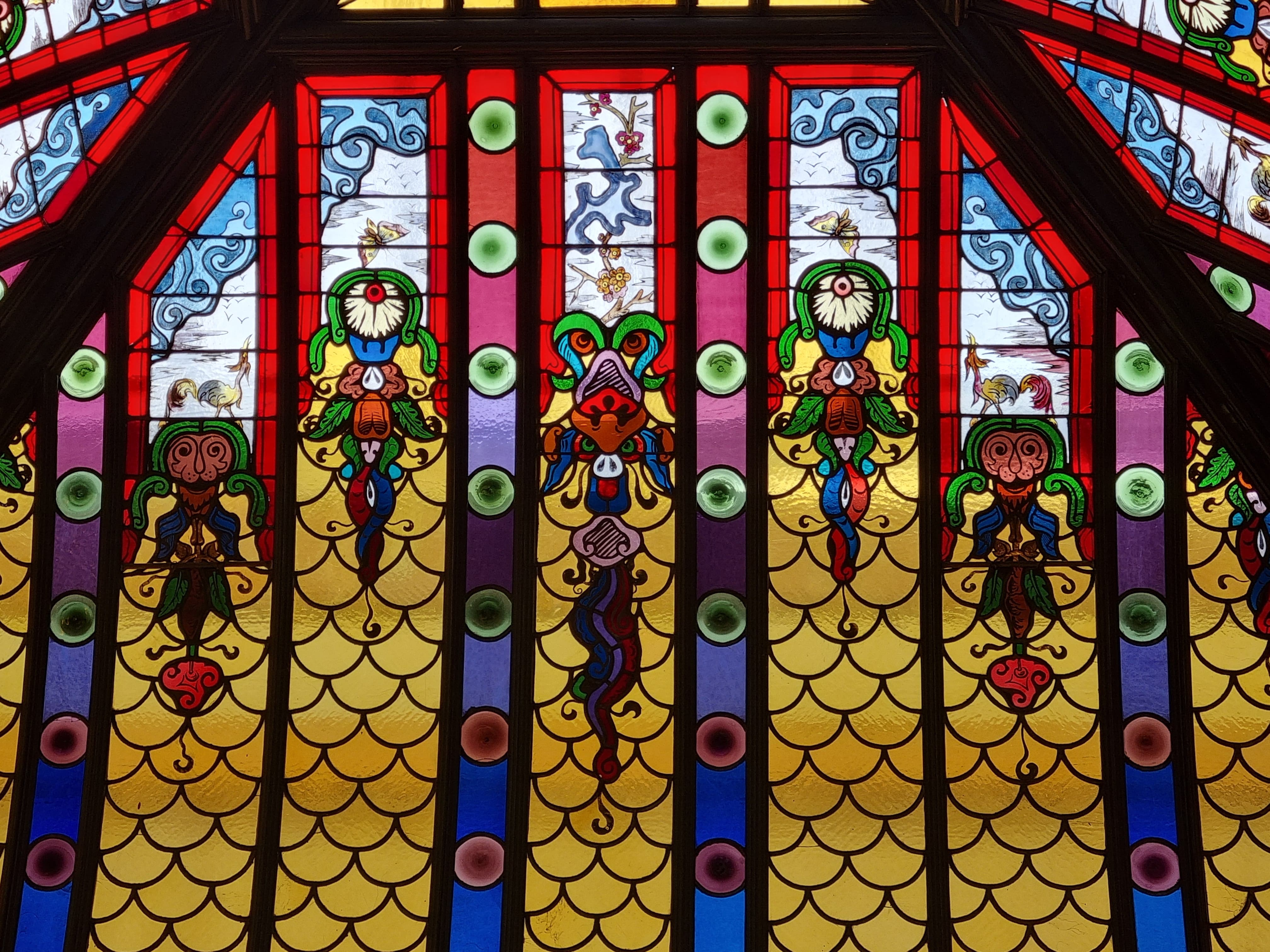 Ich lasse meinen Blick über die Decke schweifen und sehe plötzlich in eine andere Welt – durch ein Loch in der Decke bewundere ich die Glaskuppel der Villa. Mischgestalten tummeln sich zwischen wilden Formen am Himmel. Klar erkennen kann ich die Figürchen nicht. Unser Guide versichert mir, dass ich später noch einen genaueren Blick auf die kunstvollen Glasmalereien erhaschen werde.