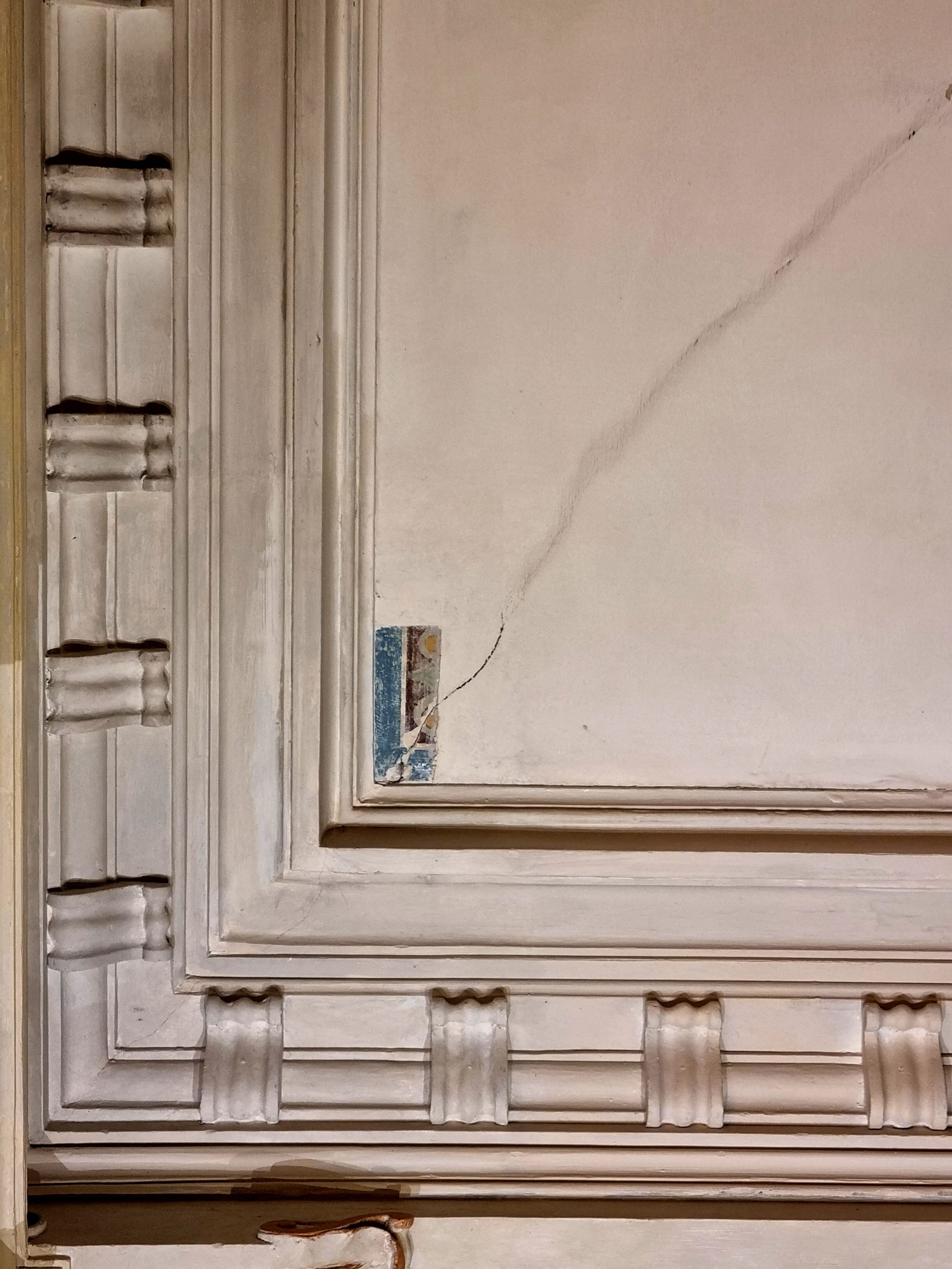 Die Spuren der Restauration sind Teil der Villa geworden und zeugen von ihrer langen Geschichte. An einer Säule ist deutlich zu erkennen, wie die weisse Wandfarbe Schicht für Schicht abgetragen worden ist. An einer Stelle wurde zu viel Farbe entfernt und ein Fleck blaue Grundfarbe ziert die Säule.