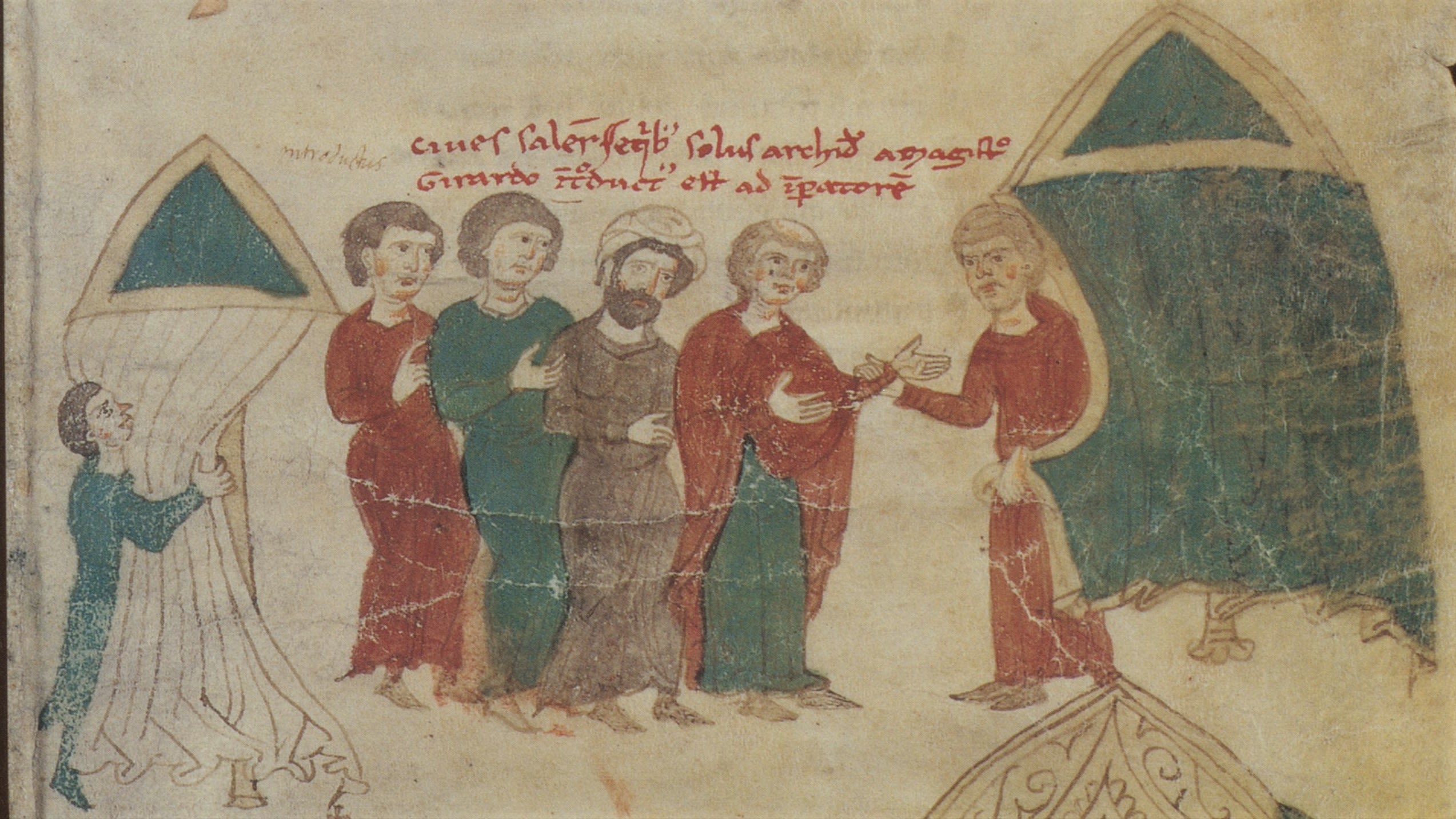 Die Hochzeit von Konstanze von Sizilien mit Kaiser Heinrich VI. des Staufergeschlechtes (Petrus de Ebulo: Liber ad honorem Augusti, Burgerbibliothek Bern Cod. 120.II, fol. 96r).