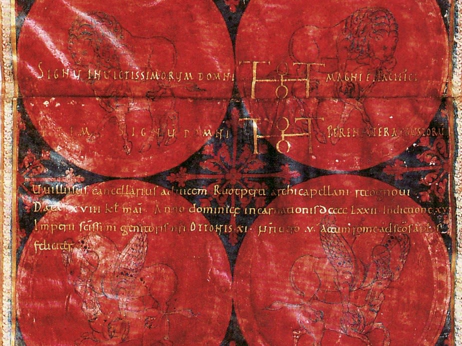 Heiratsurkunde der byzantinischen Prinzessin Theophanu, spätere römisch-deutsche Königin und Kaiserin (Bildausschnitt: Signumzeilen mit den Monogrammen der Kaiser Otto I. und Otto II.) (Staatsarchiv Wolfenbüttel 6 Urk 11, Wikimedia)