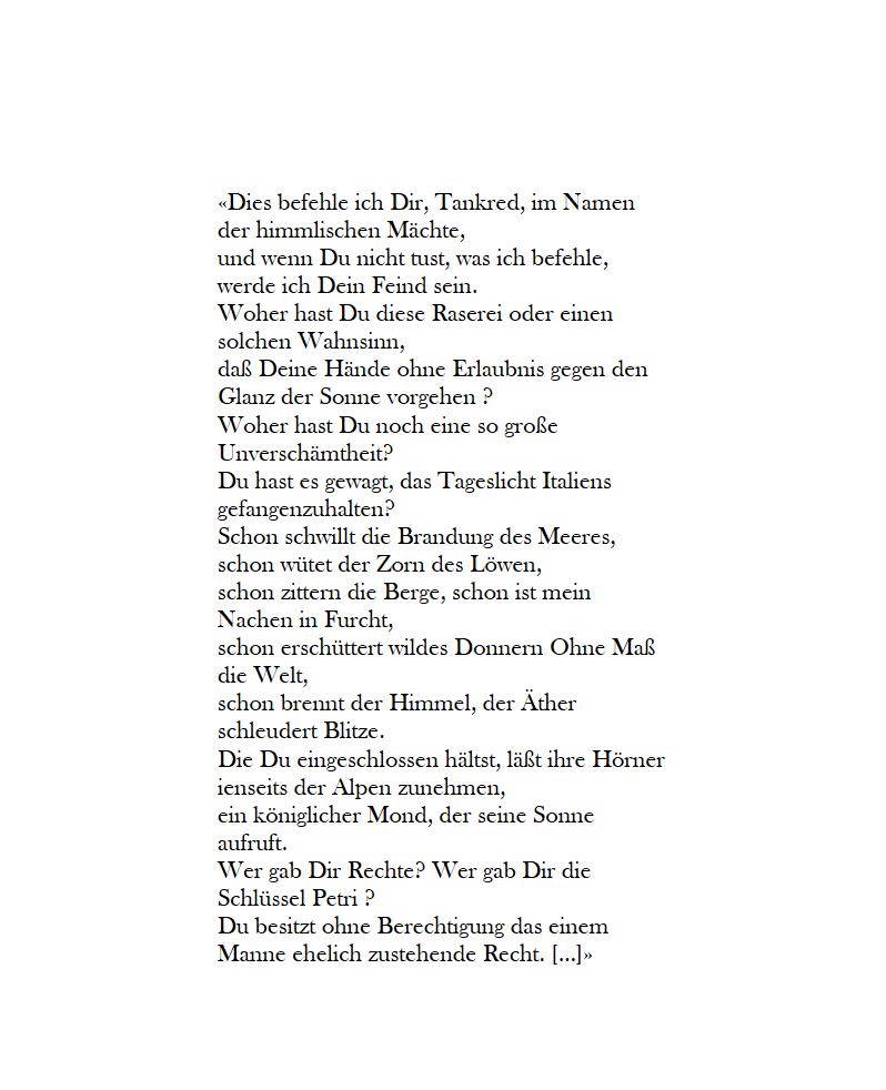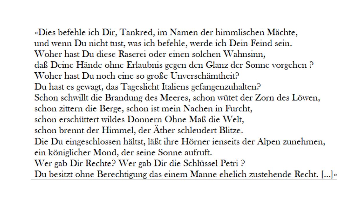 « […] Es gehen doch so viele in die Kirche, denen der Sinn draußen geblieben ist und nur an ihrem Ansehen und ihrem Besitz daheim hängt. Sie schenken meinem Leiden keine Aufmerksamkeit und vergessen es immer wieder. So könnte es dir auch ergehen, wenn ich dir Ehre und Gut weiterhin lasse, anstatt sie dir zu nehmen. Pass nur auf, ich kenne deine Schwachstellen.»