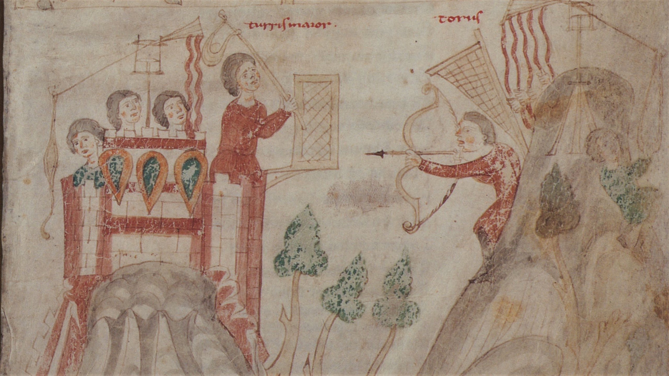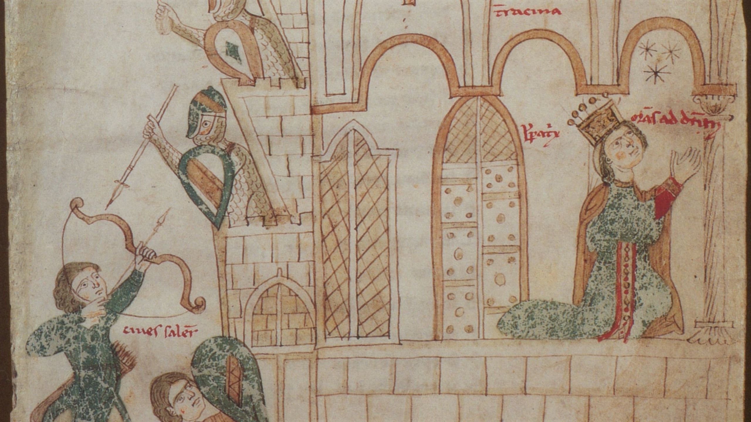Konstanze (imperatrix) als Gefangene im Castel dell'Ovo in Neapel (Petrus de Ebulo: Liber ad honorem Augusti, Burgerbibliothek Bern Cod. 120.II, fol. 126r.)